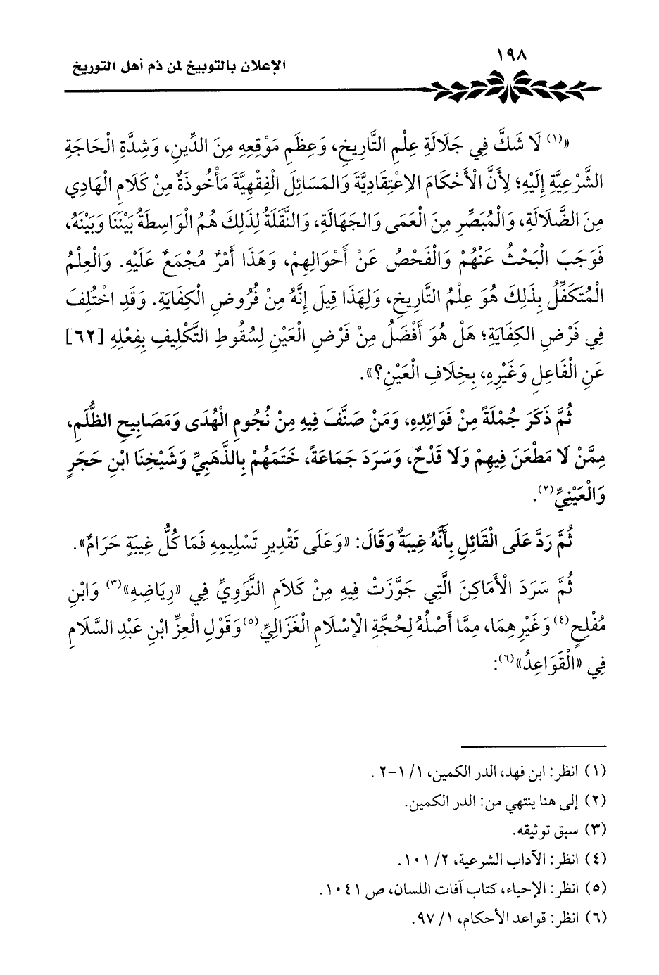 " (¬١) لَا شَكَّ فِي جَلَالَةِ عِلْمِ التَّارِيخِ، وَعِظَمِ مَوْقِعِهِ مِنَ الدِّينِ، وَشِدَّةِ الْحَاجَةِ الشَّرْعِيَّةِ إِلَيْهِ؛ لِأَنَّ الْأَحْكَامَ الاعْتِقَادِيَّةَ وَالمَسَائِلَ الْفِقْهِيَّةَ مَأْخُوذَةٌ مِنْ كَلَامِ الْهَادِي مِنَ الضَّلَالَةِ، وَالْمُبَصِّرِ مِنَ الْعَمَى وَالجَهَالَةِ، وَالنَّقَلَةُ لِذَلِكَ هُمُ الْوَاسِطَةُ بَيْنَنَا وَبَيْنَهُ، فَوَجَبَ الْبَحْثُ عَنْهُمْ وَالْفَحْصُ عَنْ أَحْوَالِهِمْ، وَهَذَا أَمْرٌ مُجْمَعٌ عَلَيْهِ. وَالْعِلْمُ الْمُتَكَفِّلُ بِذَلِكَ هُوَ عِلْمُ التَّارِيخِ، وَلِهَذَا قِيلَ إِنَّهُ مِنْ فُرُوضِ الْكِفَايَةِ. وَقَدِ اخْتُلِفَ فِي فَرْضِ الكِفَايَةِ؛ هَلْ هُوَ أَفْضَلُ مِنْ فَرْضِ الْعَيْنِ لِسُقُوطِ التَّكْلِيفِ بِفِعْلِهِ عَنِ الْفَاعِلِ وَغَيْرِهِ، بِخِلَافِ الْعَيْنِ؟ ".