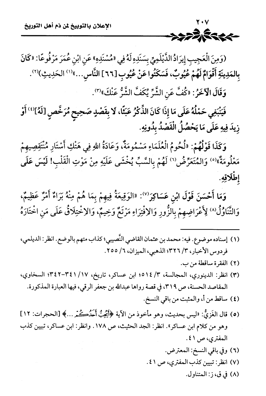 (وَمِنَ الْعَجِيبِ إِيرَادُ الدَّيْلَمِيِّ بِسَنَدِهِ لَهُ فِي "مُسْنَدِهِ" عَنِ ابْنِ عُمَرَ مَرْفُوعًا: "كَانَ بِالمَدِينَةِ أَقْوَامٌ لَهُمْ عُيُوبٌ، فَسَكَتُوا عَنْ عُيُوبِ النَّاسِ ... " (¬١) الحَدِيثِ) (¬٢).