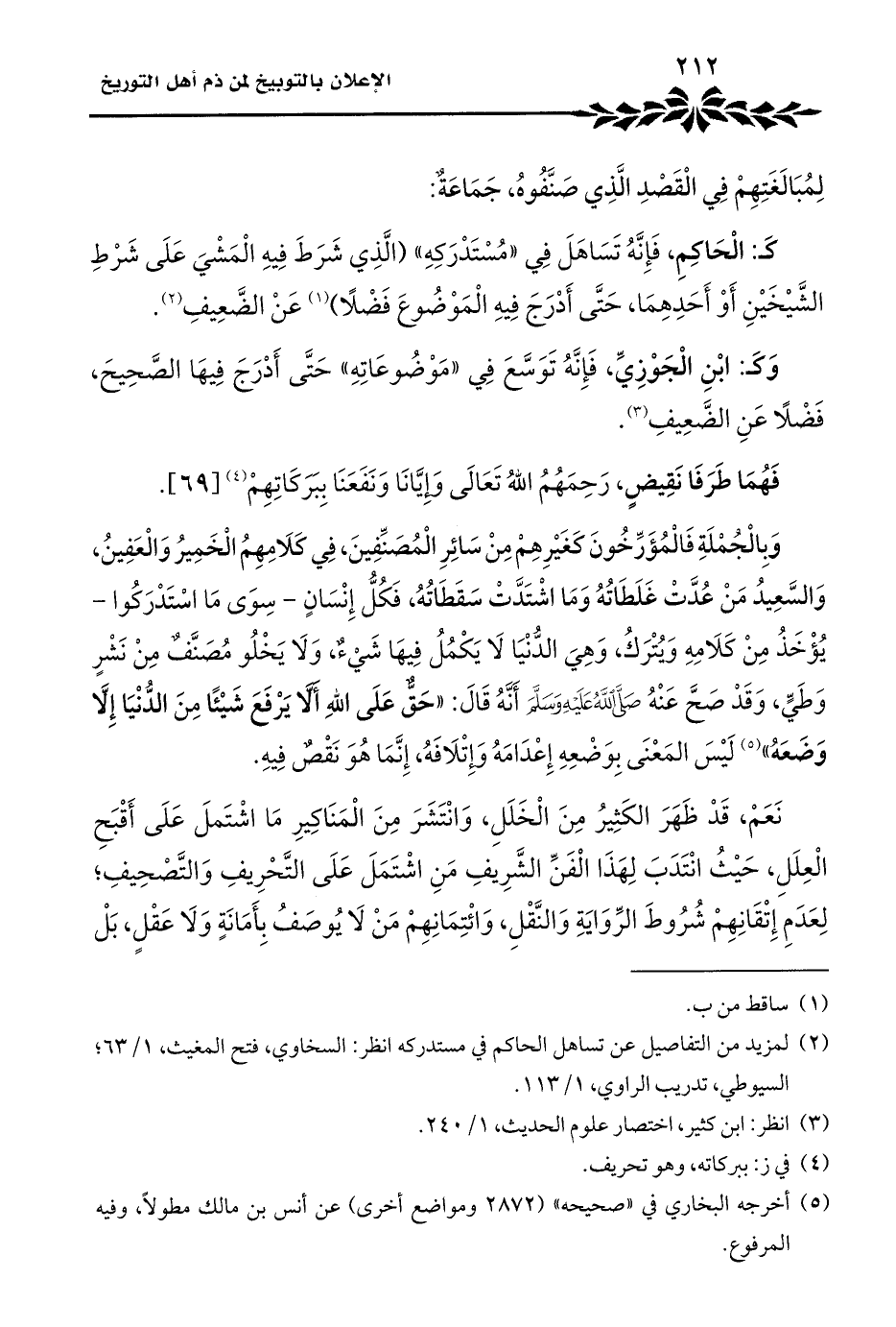 (¬٢) لمزيد من التفاصيل عن تساهل الحاكم في مستدركه انظر: السخاوي، فتح المغيث، ١/ ٦٣؛ السيوطي، تدريب الراوي، ١/ ١١٣.