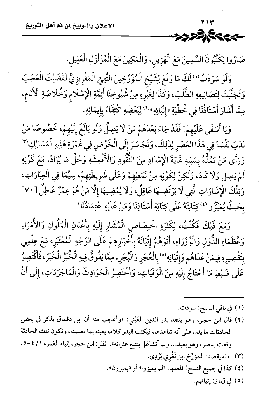 وَلَوْ سَرَدْتُ (¬١) لَكَ مَا وَقَعَ لِشَيْخِ الْمُؤَرِّخِينَ التَّقِيِّ الْمَقْرِيزِيِّ لَقَضَيْتَ الْعَجَبَ وَتَجَنَّبْتَ لِتَصَانِيفِهِ الطَّلَبَ، وَكَذَا لِغَيْرِهِ مِنْ شُيُوخِنَا أَئِمَّةِ الْإِسْلَامِ وَخُلَاصَةِ الْأَنَامِ، مِمَّا أَشَارَ أُسْتَاذُنَا فِي خُطْبَةِ "إِنْبَائِهِ" (¬٢) لِبَعْضِهِ اكتِفَاءً بِإِيمَائِهِ.