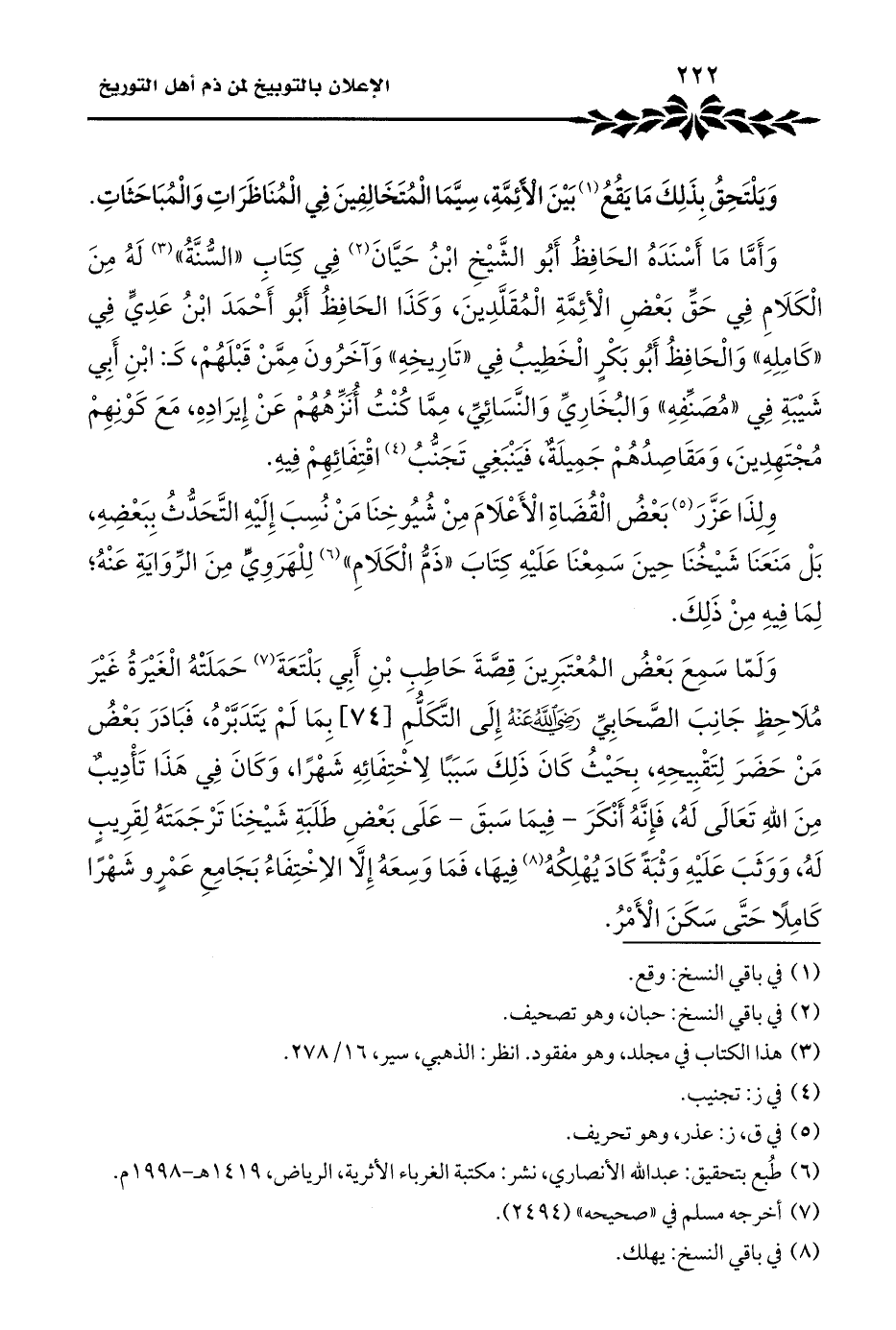 وَأَمَّا مَا أَسْنَدَهُ الحَافِظُ أَبُو الشَّيْخِ ابْنُ حَيَّانَ (¬٢) فِي كِتَاب "السُّنَّةُ" (¬٣) لَهُ مِنَ الْكَلَامِ فِي حَقِّ بَعْضِ الْأئِمَّةِ الْمُقَلَّدِينَ، وَكَذَا الحَافِظُ أَبُو أَحْمَدَ ابْنُ عَدِيٍّ فِي "كَامِلِهِ" وَالْحَافِظُ أَبُو بَكْرٍ الْخَطِيبُ فِي "تَارِيخِهِ" وَآخَرُونَ مِمَّنْ قَبْلَهُمْ، كَـ: ابْنِ أَبِي شَيْبَةِ فِي "مُصَنِّفِهِ" وَالبُخَارِيِّ وَالنَّسَائِيِّ، مِمَّا كُنْتُ أُنَزِّهُهُمْ عَنْ إِيرَادِهِ، مَعَ كَوْنِهِمْ مُجْتَهِدِينَ، وَمَقَاصِدُهُمْ جَمِيلَةٌ، فَيَنْبَغِي تَجَنُّبُ (¬٤) اقْتِفَائِهِمْ فِيهِ.