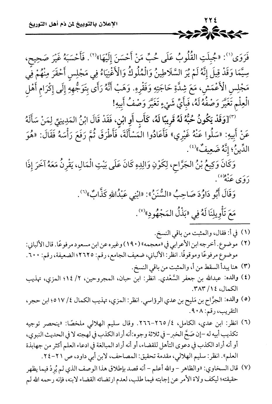 (¬٦) انظر: ابن عدي، الكامل، ٤/ ٢٦٥ - ٢٦٦. وقال سليم الهلالي ملخصًا: "ينحصر توجيه تكذيب أبيه له -إن صَحَّ الخبر- في ثلاثة وجوه: أنه أراد الكذب في لهجته لا في الحديث النبوي، أو أنه أراد الكذب في دعوى التأهل للقضاء، أو أنه أراد المبالغة في ادعاء العلم أكثر من جهابذة العلم". انظر: سليم الهلالي، مقدمة تحقيق: المصاحف، لابن أبي داود، ص ٢١ - ٢٤.