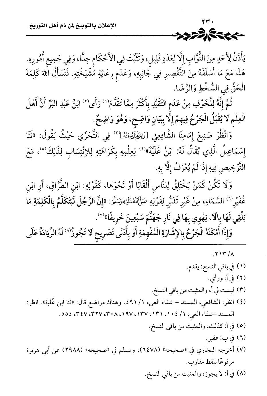 ثُمَّ إِنَّهُ لِلْخَوْفِ مِنْ عَدَمِ التَقَيُّدِ بِأَكْثَرَ مِمَّا تَقَدَّمَ (¬١) رَأَى (¬٢) ابْنُ عَبْدِ البَرِّ أَنَّ أَهْلَ الْعِلْمِ لَا يُقْبَلُ الْجَرْحُ فِيهِمْ إِلَّا بِبَيَانٍ وَاضِحٍ، وَهُوَ وَاضِحٌ.