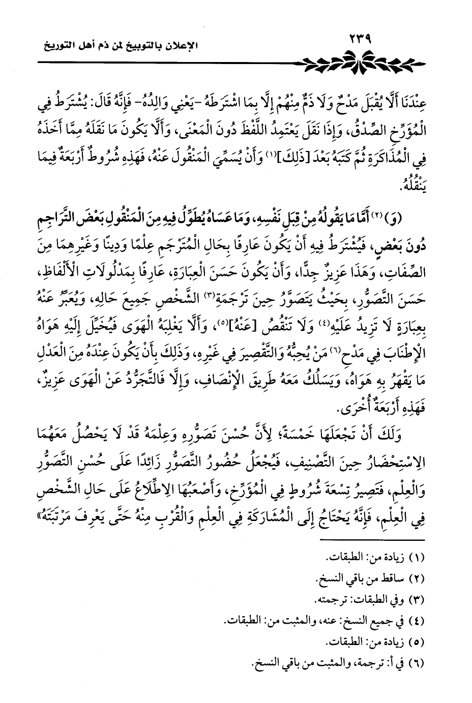 وَلَكَ أَنْ تَجْعَلَهَا خَمْسَةً؛ لِأَنَّ حُسْنَ تَصَوُّرِهِ وَعِلْمَهُ قَدْ لَا يَحْصُلُ مَعَهُمَا الِاسْتِحْضَارُ حِينَ التَّصْنِيفِ، فَيُجْعَلُ حُضُورُ التَّصَوُّرِ زَائِدًا عَلَى حُسْنِ التَّصَوُّرِ وَالْعِلْمِ، فَتَصِيرُ تِسْعَةَ شُرُوطٍ فِي الْمُؤَرِّخِ، وَأَصْعَبُهَا الِاطِّلَاعُ عَلَى حَالِ الشَّخْصِ فِي الْعِلْمِ، فَإِنَّهُ يَحْتَاجُ إِلَى الْمُشَارَكَةِ فِي الْعِلْمِ وَالْقُرْبِ مِنْهُ حَتَّى يَعْرِفَ مَرْتَبَتَهُ"