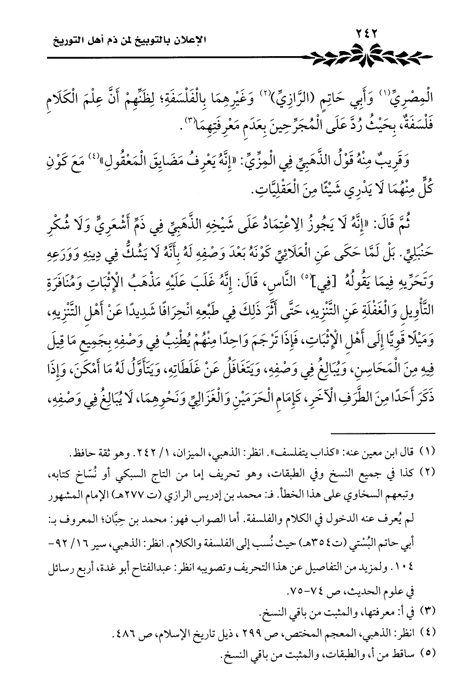 (¬٢) كذا في جميع النسخ وفي الطبقات، وهو تحريف إما من التاج السبكي أو نُسّاخ كتابه، وتبعهم السخاوي على هذا الخطأ. فـ: محمد بن إدريس الرازي (ت ٢٧٧ هـ) الإمام المشهور لم يُعرف عنه الدخول في الكلام والفلسفة. أما الصواب فهو: محمد بن حِبَّان؛ المعروف بـ: أبي حاتم البُسْتي (ت ٣٥٤ هـ) حيث نُسب إلى الفلسفة والكلام. انظر: الذهبي، سير ١٦/ ٩٢ - ١٠٤. ولمزيد من التفاصيل عن هذا التحريف وتصويبه انظر: عبد الفتاح أبو غدة، أربع رسائل في علوم الحديث، ص ٧٤ - ٧٥.