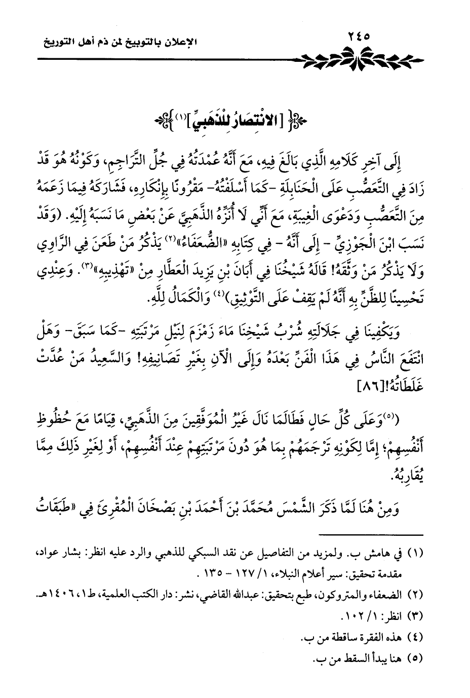 ((¬٥) وعلَى كُلِّ حَالٍ فَطَالَمَا نَالَ غَيْرُ الْمُوَفَّقِينَ مِنَ الذَّهَبِيِّ، قِيَامًا مَعَ حُظُوظِ أَنْفُسِهِمْ؛ إِمَّا لِكَوْنِهِ تَرْجَمَهُمْ بِمَا هُوَ دُونَ مَرْتَبَتِهِمْ عِنْدَ أَنْفُسِهِمْ، أَوْ لِغَيْرِ ذَلِكَ مِمَّا يُقَارِبُهُ.