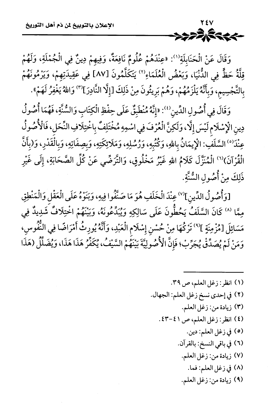 [وَأُصُولُ الدِّينِ] (¬٧) عِنْدَ الْخَلَفِ هُوَ مَا صَنَّفُوا فِيهِ، وَبَنَوْهُ عَلَى الْعَقْلِ وَالْمَنْطِقِ مِمَّا (¬٨) كَانَ السَّلَفُ يَحُطُّونَ عَلَى سَالِكِهِ وَيُبَدِّعُونَهُ، وَبَيْنَهُمْ اخْتِلَافٌ شَدِيدٌ فِي مَسَائِلَ [مُزْمِنَةٍ] (¬٩) تَرْكُهَا مِنْ حُسْنِ إِسْلَامِ الْعَبْدِ، وَأَنَّهُ يُورِثُ أَمْرَاضًا فِي النُّفُوسِ، وَمَنْ لَمْ يُصَدِّقْ يُجَرِّبْ؛ فَإِنَّ الْأُصُولِيَّةَ بَيْنَهُمْ السَّيْفُ، يُكَفِّرُ هَذَا هَذَا، وَيُضَلِّلُ (هَذَا