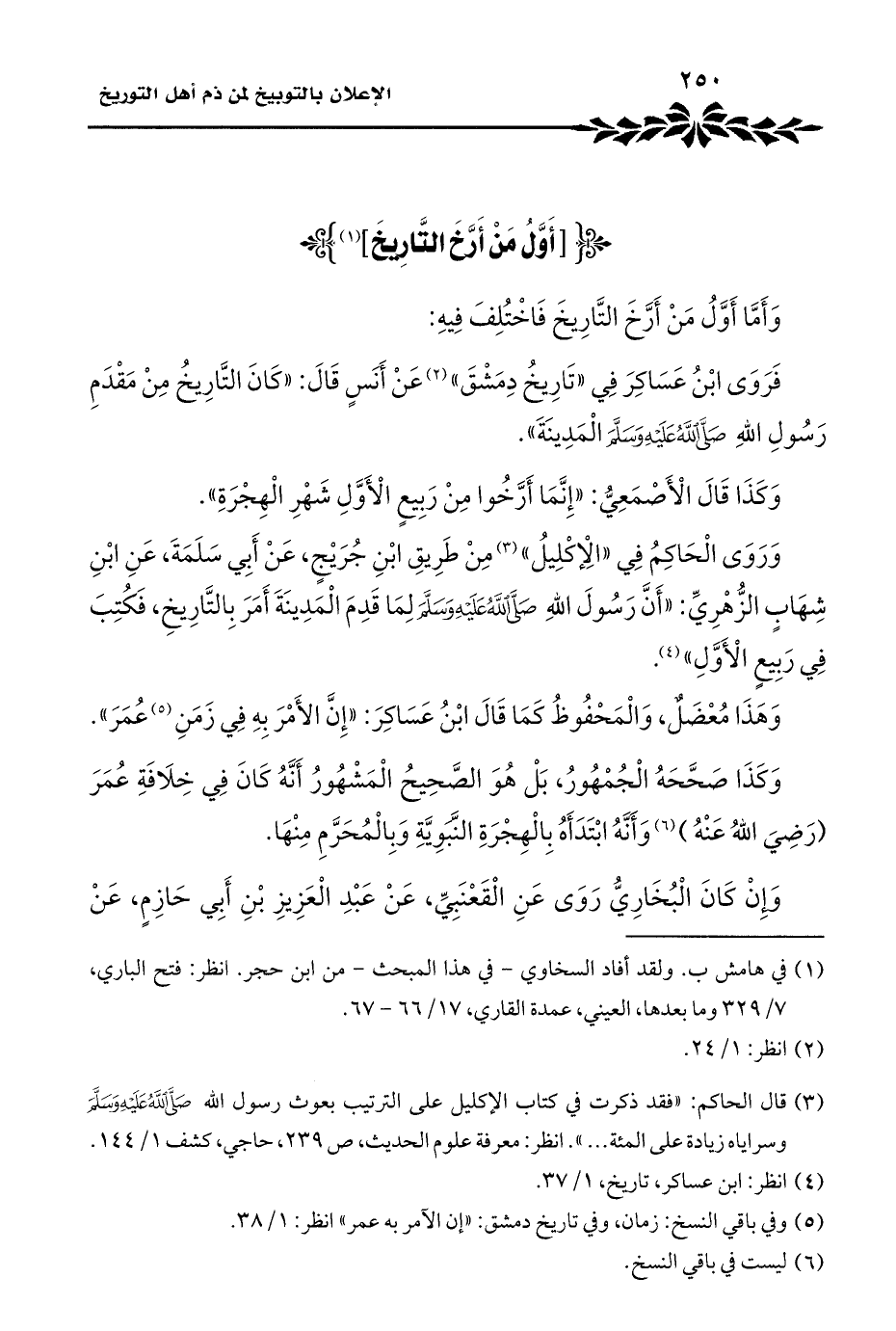 وَكَذَا صَحَّحَهُ الْجُمْهُورُ، بَلْ هُوَ الصَّحِيحُ الْمَشْهُورُ أَنَّهُ كَانَ فِي خِلَافَةِ عُمَرَ (رَضِيَ اللهُ عَنْهُ) (¬٦) وَأَنَّهُ ابْتَدَأَهُ بِالْهِجْرَةِ النَّبَوِيَّةِ وَبِالْمُحَرَّمِ مِنْهَا.