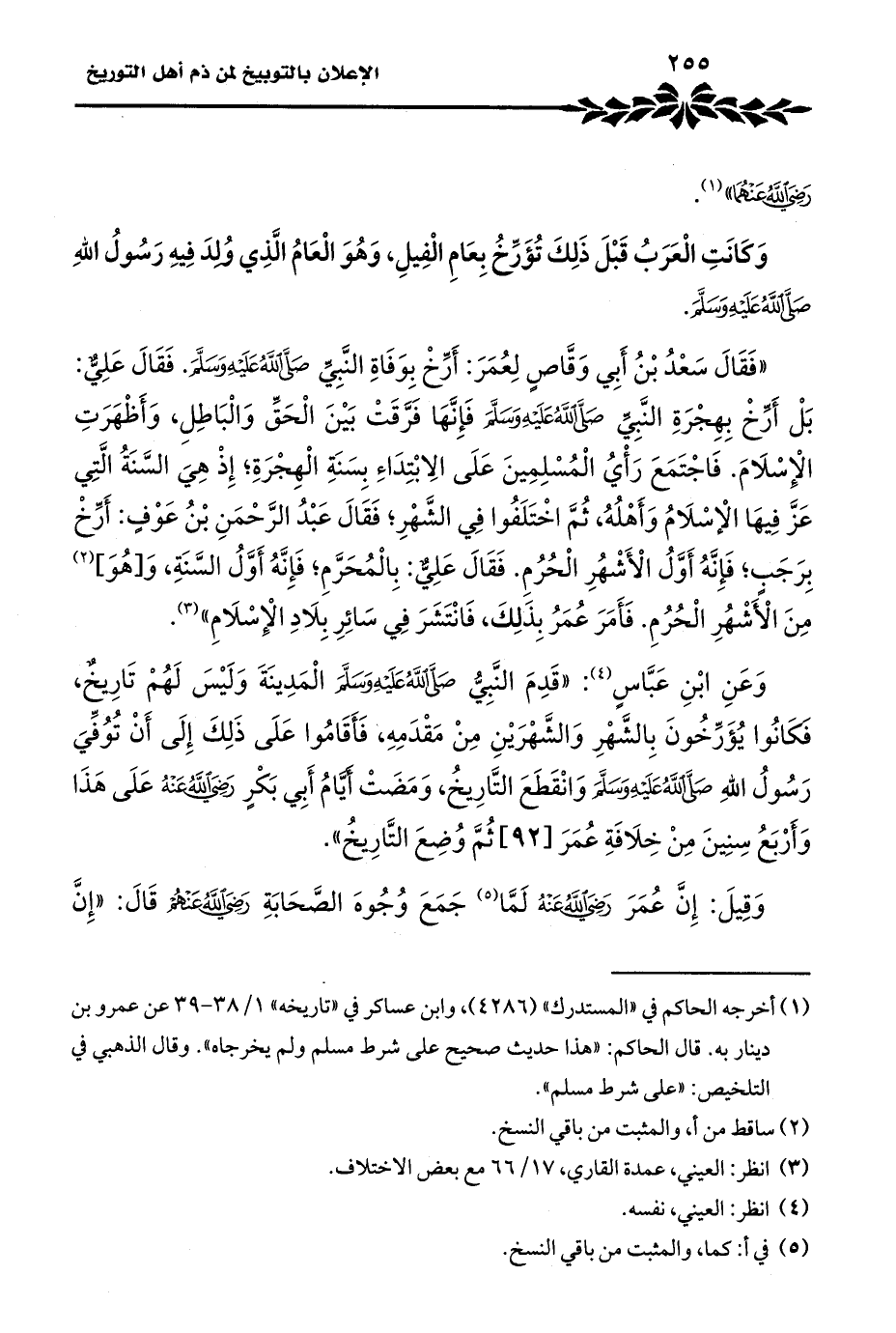"فَقَالَ سَعْدُ بْنُ أَبِي وَقَّاصٍ لِعُمَرَ: أَرِّخْ بِوَفَاةِ النَّبِيِّ -صلى الله عليه وسلم-. فَقَالَ عَلِيٌّ: بَلْ أَرِّخْ بِهِجْرَةِ النَّبِيِّ -صلى الله عليه وسلم- فَإِنَّهَا فَرَّقَتْ بَيْنَ الْحَقِّ وَالْبَاطِلِ، وَأَظْهَرَتِ الْإِسْلَامَ. فَاجْتَمَعَ رَأْيُ الْمُسْلِمِينَ عَلَى الِابْتِدَاءِ بِسَنَةِ الْهِجْرَةِ؛ إِذْ هِيَ السَّنَةُ الَّتِي عَزَّ فِيهَا الْإسْلَامُ وَأَهْلُهُ، ثُمَّ اخْتَلَفُوا فِي الشَّهْرِ؛ فَقَالَ عَبْدُ الرَّحْمَنِ بْنُ عَوْفٍ: أَرِّخْ بِرَجَبٍ؛ فَإِنَّهُ أَوَّلُ الْأَشْهُرِ الْحُرُمٍ. فَقَالَ عَلِيٌّ: بِالْمُحَرَّمِ؛ فَإِنَّهُ أَوَّلُ السَّنَةِ، وَ [هُوَ] (¬٢) مِنَ الأَشْهُرِ الْحُرُمِ. فَأَمَرَ عُمَرُ بِذلِكَ، فَانْتَشَرَ فِي سَائِرِ بِلَادِ الْإِسْلَامِ" (¬٣).