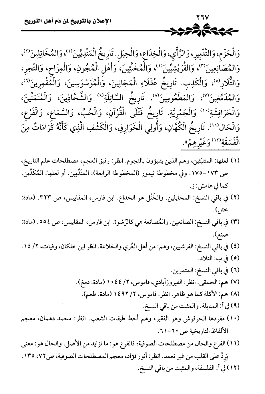 وَالْحَزْمِ، وَالتَّدْبِيرِ، وَالرَّأْيِ، وَالْخِدَاعِ، وَالْحِيَلِ. تَارِيخُ الْمَنْدِيِّينَ (¬١)، وَالمُخَاتِلِينَ (¬٢)، وَالمُصَانِعِينَ (¬٣)، وَالفُرَيْشِيِّينَ (¬٤)، وَالْمُخَنَّثِينَ، وَأَهْلِ الْمُجُونِ، وَالْمِزَاحِ، وَالتّجرِ، وَالتُّلَارِ (¬٥)، وَالْكَذِبِ. تَارِيخُ عُقَلَاءِ الْمَجَانِينَ، وَالْمُوَسْوَسِينَ، وَالْمُقْمِرِينَ (¬٦)، وَالمُدَمِّغِينَ (¬٧)، وَالمَطْعُومِينَ (¬٨). تَارِيخُ السَّائِلَةِ (¬٩) وَالشَّحَّاذِينَ، وَالْمُتَمَنِّينَ، وَالْحَرَافِشَةِ (¬١٠) وَالْجَمْرِيَّةِ. تَارِيخُ قَتْلَى الْقُرْآنِ، وَالْحُبِّ، وَالسَّمَاعِ، وَالْفَرْعِ، وَالْحَال (¬١١). تَارِيخُ الْكُهَّانِ، وَأُولِي الْخَوَارِقِ، وَالْكَشْفِ الَّذِي كَأَنَّهُ كَرَامَاتٌ مِنَ الْفَسَقَةِ (¬١٢) وَغَيْرِهِمْ".
