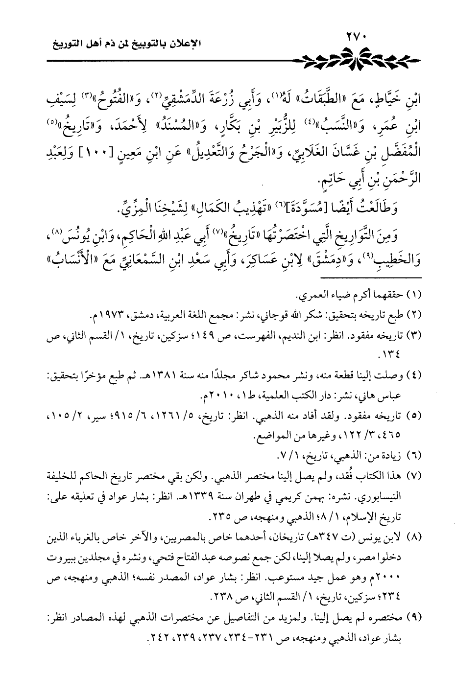 (¬٩) مختصره لم يصل إلينا. ولمزيد من التفاصيل عن مختصرات الذهبي لهذه المصادر انظر: بشار عواد، الذهبي ومنهجه، ص ٢٣١ - ٢٣٤، ٢٣٧، ٢٣٩، ٢٤٢.
