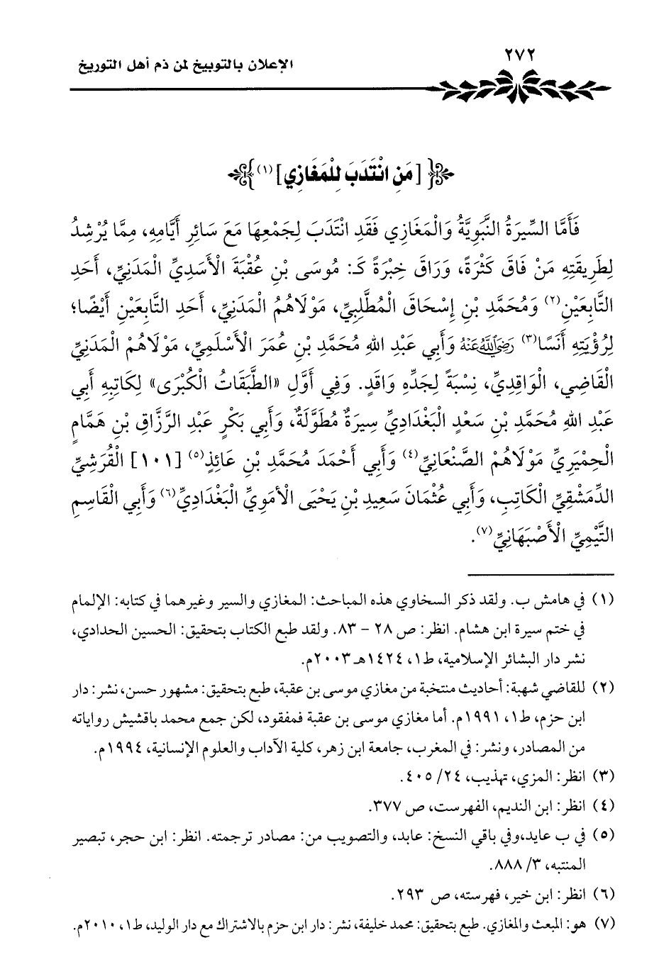 فَأَمَّا السِّيرَةُ النَّبَوِيَّةُ وَالْمَغَازِي فَقَدِ انْتَدَبَ لِجَمْعِهَا مَعَ سَائِرِ أَيَّامِهِ، مِمَّا يُرْشِدُ لِطَرِيقَتِهِ مَنْ فَاقَ كَثْرَةً، وَرَاقَ خِبْرَةً: مُوسَى بْنِ عُقْبَةَ الْأَسَدِيِّ الْمَدَنِيِّ، أَحَدِ التَّابِعَيْنِ (¬٢) وَمُحَمَّدِ بْنِ إِسْحَاقَ الْمُطَّلِبِيِّ، مَوْلَاهُمُ الْمَدَنِيِّ، أَحَدِ التَّابِعَيْنِ أَيْضًا؛ لِرُؤْيَتِهِ أَنَسًا (¬٣) -رضي الله عنه- وَأَبِي عَبْدِ اللهِ مُحَمَّدِ بْنِ عُمَرَ الْأَسْلَمِيِّ، مَوْلَاهُمْ الْمَدَنِيِّ الْقَاضِي، الْوَاقِدِيِّ، نِسْبَةً لِجَدِّهِ وَاقَدٍ. وَفِي أَوَّلِ "الطَّبَقَاتُ الْكُبْرَى" لِكَاتِبِهِ أَبِي عَبْدِ اللهِ مُحَمَّدِ بْنِ سَعْدٍ الْبَغْدَادِيِّ سِيرَةٌ مُطَوَّلَةٌ، وَأَبِي بَكْرٍ عَبْدِ الرَّزَّاقِ بْنِ هَمَّامٍ الْحِمْيَرِيِّ مَوْلَاهُمْ الصَّنْعَانِيِّ (¬٤) وَأَبِي أَحْمَدَ مُحَمَّدِ بْنِ عَائِذٍ (¬٥) الْقُرَشِيِّ الدِّمَشْقِيِّ الْكَاتِبِ، وَأَبِي عُثْمَانَ سَعِيدِ بْنِ يَحْيَى الْأَمَوِيِّ الْبَغْدَادِيِّ (¬٦) وَأَبِي الْقَاسِمِ التَّيْمِيِّ الْأَصْبَهَانِيِّ (¬٧).