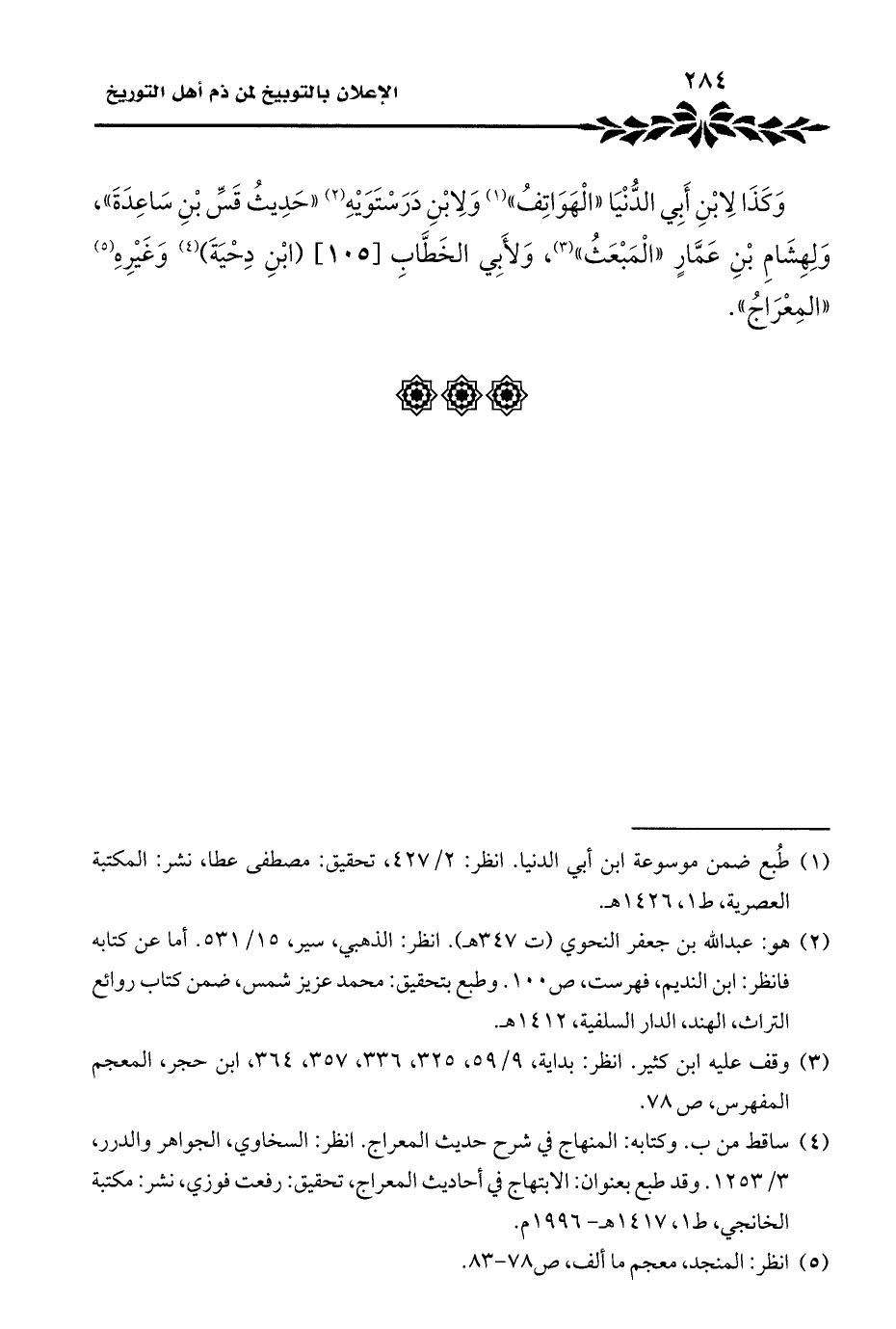 وَكَذَا لِابْنِ أَبِي الدُّنْيَا "الْهَوَاتِفُ" (¬١) وَلِابْنِ دَرَسْتَوَيْهِ (¬٢) "حَدِيثُ قَسِّ بْنِ سَاعِدَةَ"، وَلِهِشَامِ بْنِ عَمَّارٍ "الْمَبْعَثُ" (¬٣)، وَلأَبِي الخَطَّابِ (ابْنِ دِحْيَةَ) (¬٤) وَغَيْرِهِ (¬٥) "المِعْرَاجُ".