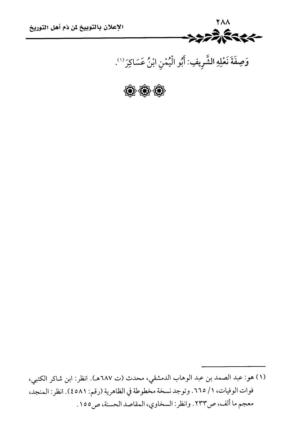 وَصِفَةَ نَعْلِهِ الشَّرِيفِ: أَبُو الْيُمْنِ ابْنُ عَسَاكِرَ (¬١).
