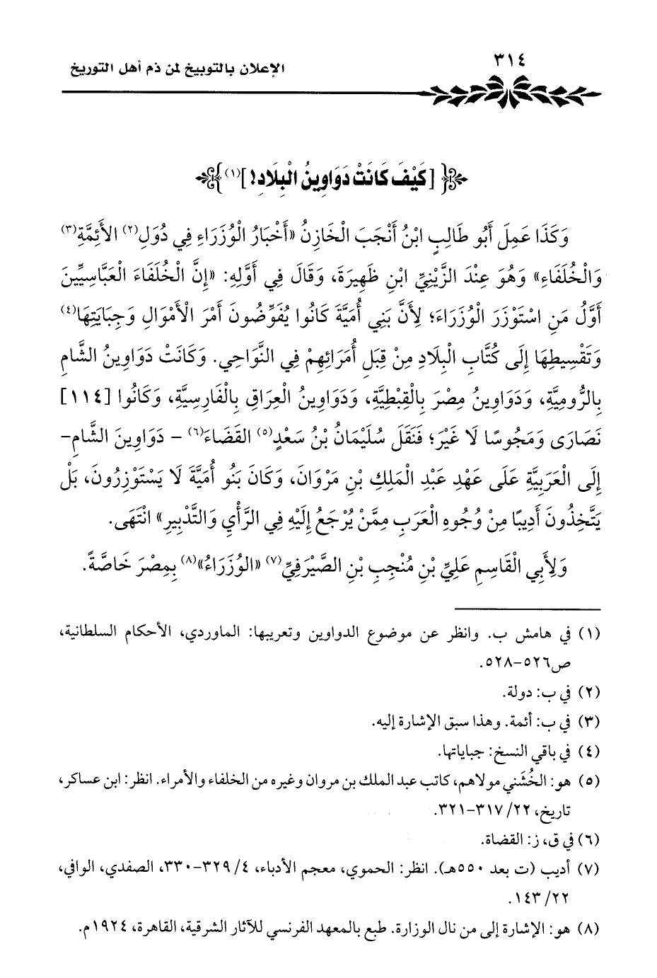 وَكَذَا عَمِلَ أَبُو طَالِبٍ ابْنُ أَنْجَبَ الْخَازِنُ "أَخْبَارُ الْوُزَرَاءِ فِي دُوَلِ (¬٢) الأَئِمَّةِ (¬٣) وَالْخُلَفَاءِ" وَهُوَ عِنْدَ الزَّيْنِيِّ ابْنِ ظَهِيرَةَ، وَقَالَ فِي أَوَّلِهِ: "إِنَّ الْخُلَفَاءَ الْعَبَّاسِيِّينَ أَوَّلُ مَنِ اسْتَوْزَرَ الْوُزَرَاءَ؛ لِأَنَّ بَنِي أُمَيَّةَ كَانُوا يُفَوِّضُونَ أَمْرَ الْأَمْوَالِ وَجِبَايَتِهَا (¬٤) وَتَقْسِيطِهَا إِلَى كُتَّابِ الْبِلَادِ مِنْ قِبَلِ أُمَرَائِهِمْ فِي النَّوَاحِي. وَكَانَتْ دَوَاوِينُ الشَّامِ بِالرُّومِيَّةِ، وَدَوَاوِينُ مِصْرَ بِالْقِبْطِيَّةِ، وَدَوَاوِينُ الْعِرَاقِ بِالْفَارِسِيَّةِ، وَكَانُوا نَصَارَى وَمَجُوسًا لَا غَيْرَ؛ فَنَقَلَ سُلَيْمَانُ بْنُ سَعْدٍ (¬٥) القَضَاءَ (¬٦) -دَوَاوِينَ الشَّامِ- إِلَى الْعَرَبِيَّةِ عَلَى عَهْدِ عَبْدِ الْمَلِكِ بْنِ مَرْوَانَ، وَكَانَ بَنُو أُمَيَّةَ لَا يَسْتَوْزِرُونَ، بَلْ يَتَّخِذُونَ أَدِيبًا مِنْ وُجُوهِ الْعَرَبِ مِمَّنْ يُرْجَعُ إِلَيْهِ فِي الرَّأْيِ وَالتَّدْبِيرِ" انْتَهَى.