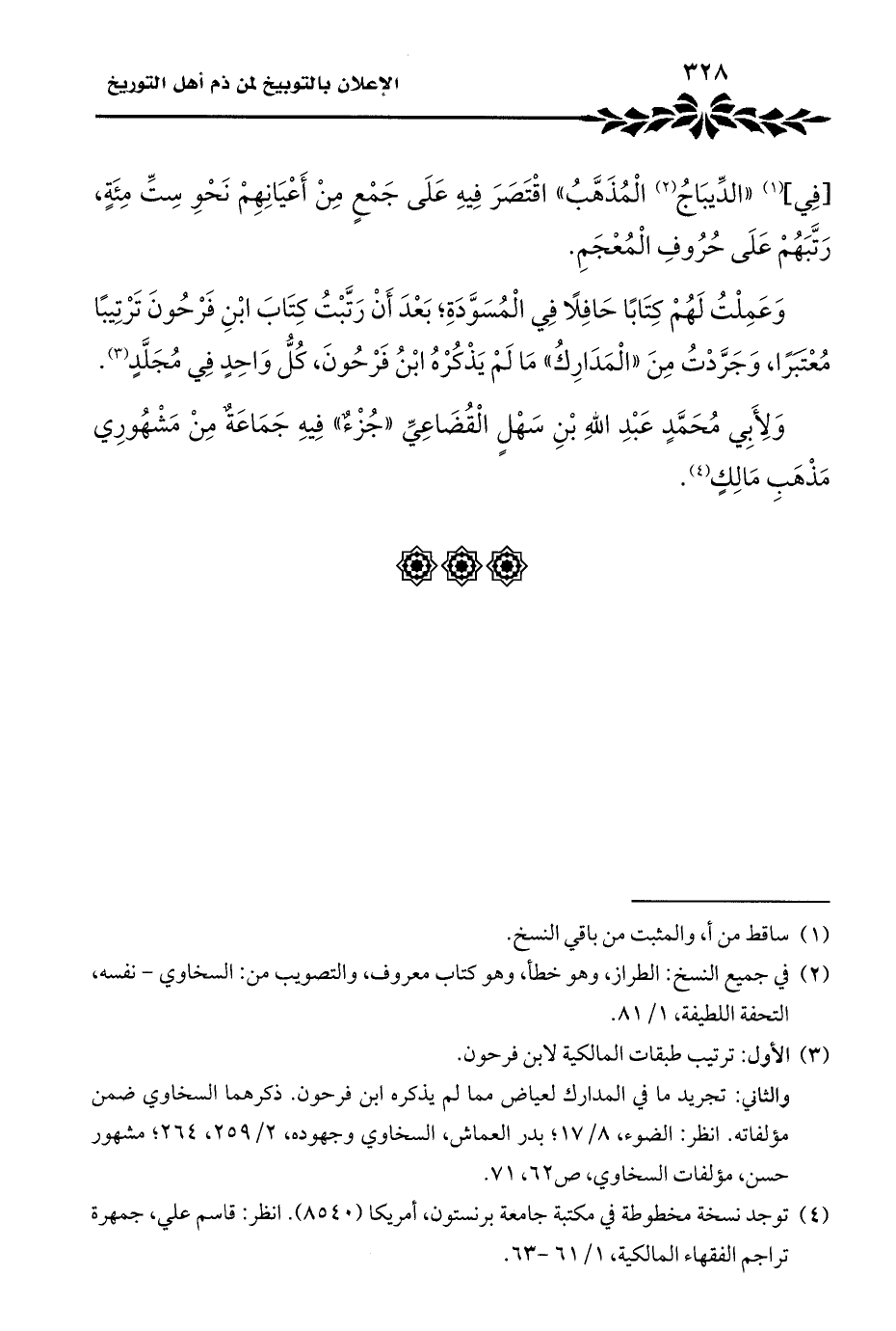 والثاني: تجريد ما في المدارك لعياض مما لم يذكره ابن فرحون. ذكرهما السخاوي ضمن مؤلفاته. انظر: الضوء، ٨/ ١٧؛ بدر العماش، السخاوي وجهوده، ٢/ ٢٥٩، ٢٦٤؛ مشهور حسن، مؤلفات السخاوي، ص ٦٢، ٧١.