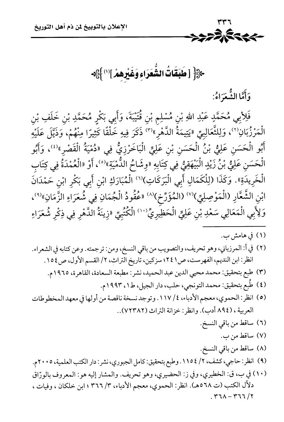 فَلِأَبِي مُحَمَّدٍ عَبْدِ اللهِ بْنِ مُسْلِمِ بْنِ قُتَيْبَةَ، وَأَبِي بَكْرٍ مُحَمَّدِ بْنِ خَلَفِ بْنِ الْمَرْزُبَانِ (¬٢)، وَلِلثَّعَالِبِيِّ "يَتِيمَةُ الدَّهْرِ" (¬٣) ذَكَرَ فِيهِ خَلْقًا كَثِيرًا مِنْهُمْ، وَذَيَّلَ عَلَيْهِ أَبُو الْحَسَنِ عَلِيُّ بْنُ الْحَسَنِ بْنِ عَلِيٍّ الْبَاخَرْزِيُّ فِي "دُمْيَةُ الْقَصْرِ" (¬٤)، وَأَبُو الْحَسَنِ عَلِيُّ بْنُ زَيْدٍ الْبَيْهَقِيُّ فِي كِتَابِهِ "وِشَاحُ الدُّمْيَةِ" (¬٥)، أَوْ "الْعُمْدَةُ فِي كِتَابِ الْخَرِيدَةِ". وَكَذَا (لِلْكَمَالِ أَبِي الْبَرَكَاتِ) (¬٦) الْمُبَارَكِ ابْنِ أَبِي بَكْرِ ابْنِ حَمْدَانَ ابْنِ الشَّعَّارِ (الْمَوْصِلِيِّ) (¬٧) (المُؤَرِّخِ) (¬٨) "عُقُودُ الْجُمَانِ فِي شُعَرَاءِ الزَّمَانِ" (¬٩)، وَلِأَبِي الْمَعَالِي سَعْدِ بْنِ عَلِيٍّ الْحَظِيرِيِّ (¬١٠) الْكُتُبِيِّ "زِينَةُ الدَّهْرِ فِي ذِكْرِ شُعَرَاءِ