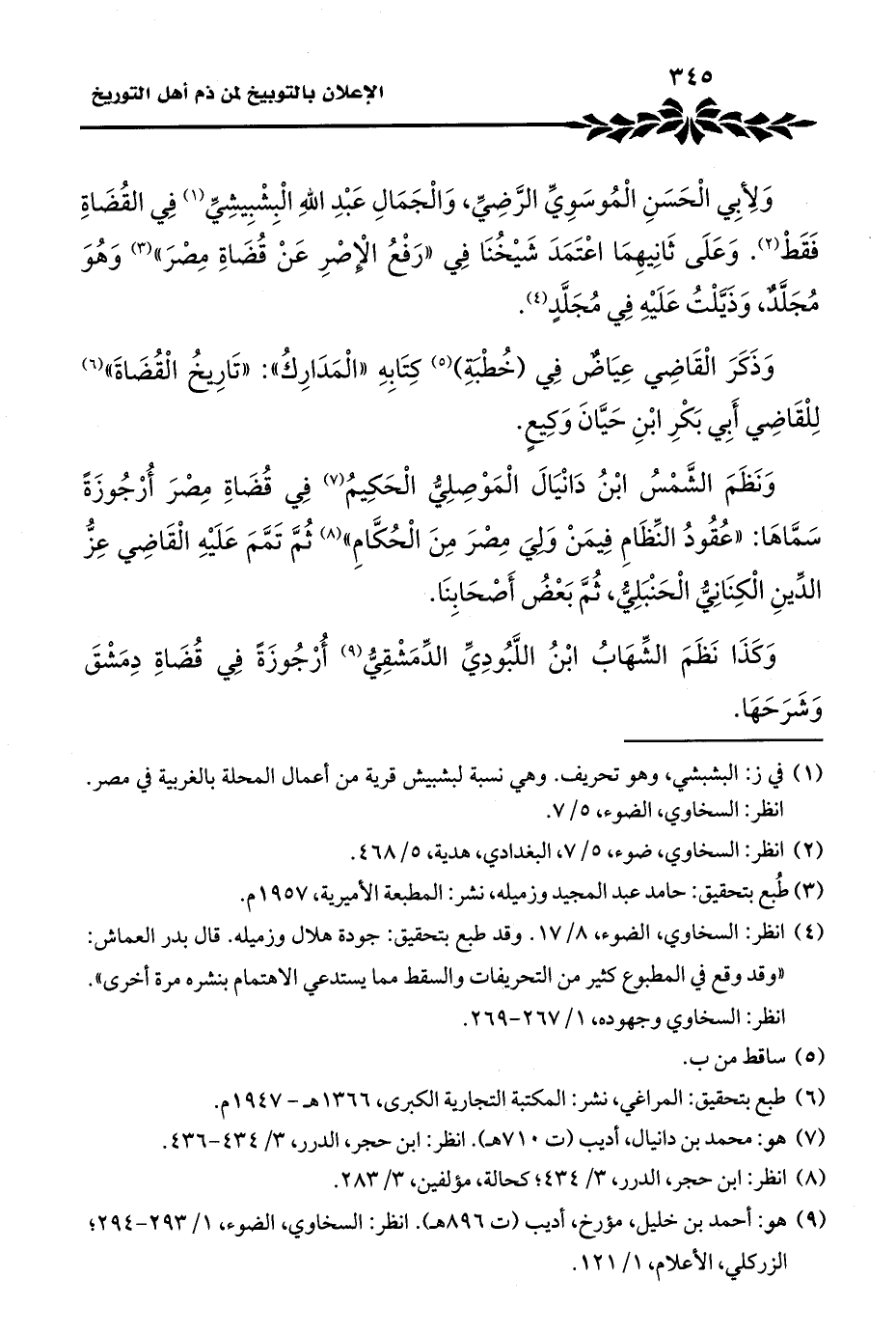 وَلِأبِي الْحَسَنِ الْمُوسَوِيِّ الرَّضِيِّ، وَالْجَمَالِ عَبْدِ اللهِ الْبِشْبِيشِيِّ (¬١) فِي القُضَاةِ فَقَطْ (¬٢). وَعَلَى ثَانِيهِمَا اعْتَمَدَ شَيْخُنَا فِي "رَفْعُ الإِصْرِ عَنْ قُضَاةِ مِصْرَ" (¬٣) وَهُوَ مُجَلَّدٌ، وَذَيَّلْتُ عَلَيْهِ فِي مُجَلَّدٍ (¬٤).