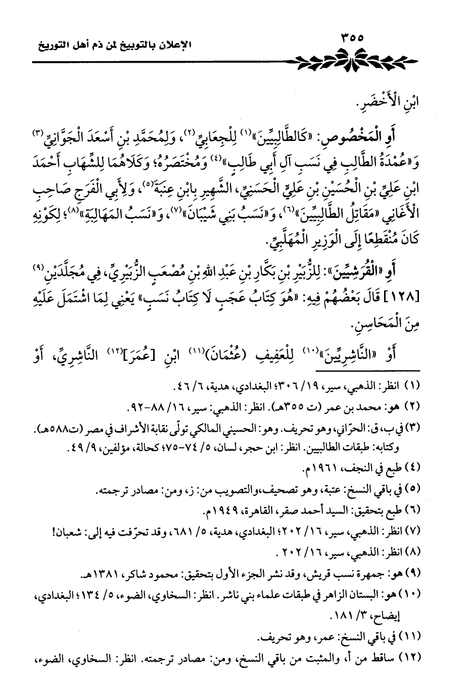 أَوِ الْمَخْصُوصِ: "كَالطَّالِبيِّينَ" (¬١) لِلْجِعَابِيِّ (¬٢)، وَلِمُحَمَّدِ بْنِ أَسْعَدَ الْجَوَّانِيِّ (¬٣) وَ"عُمْدَةُ الطَالِبِ فِي نَسَبِ آلِ أَبِي طَالِبٍ" (¬٤) وَمُخْتَصَرُهُ؛ وَكَلَاهُمَا لِلشِّهَابِ أَحْمَدَ ابْنِ عَلِيِّ بْنِ الْحُسَيْنِ بْنِ عَلِيٍّ الْحَسَنِيِّ، الشَّهِيرِ بِابْنِ عِنَبَةَ (¬٥)، وَلِأَبِي الْفَرَجِ صَاحِبِ الْأَغَانِي "مَقَاتِلُ الطَّالِبِيِّينَ" (¬٦)، وَ"نَسَبُ بَنِي شَيْبَانَ" (¬٧)، وَ"نَسَبُ المَهَالِبَةِ" (¬٨)؛ لِكَوْنِهِ كَانَ مُنْقَطِعًا إِلَى الْوَزِيرِ الْمُهَلَّبِيِّ.
