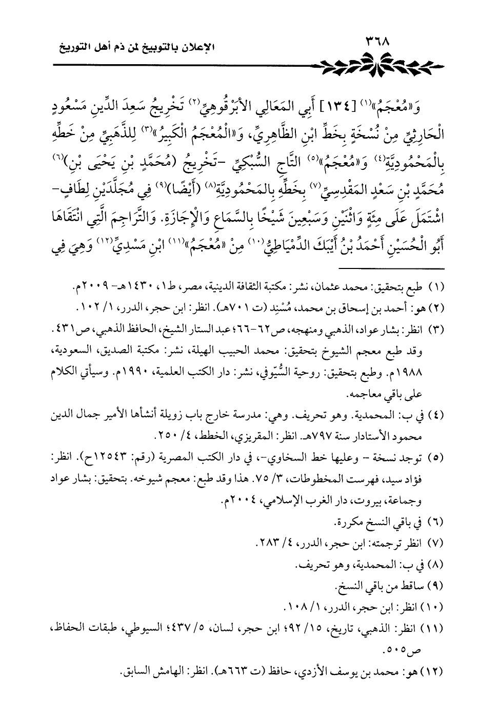 (¬٥) توجد نسخة -وعليها خط السخاوي-، في دار الكتب المصرية (رقم: ١٢٥٤٣ ح). انظر: فؤاد سيد، فهرست المخطوطات، ٣/ ٧٥. هذا وقد طبع: معجم شيوخه. بتحقيق: بشار عواد وجماعة، بيروت، دار الغرب الإسلامي، ٢٠٠٤ م.
