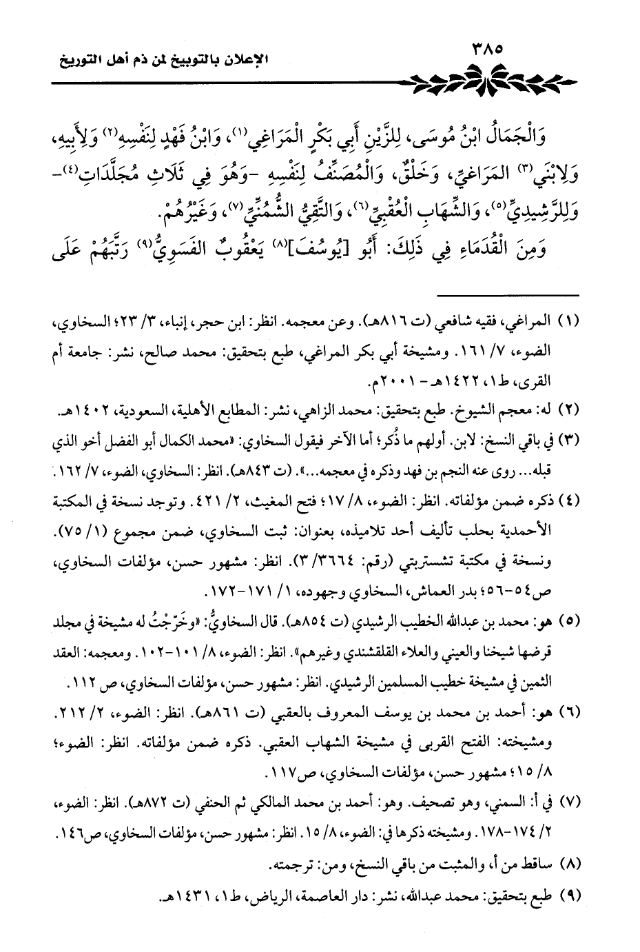 (¬١) المراغي، فقيه شافعي (ت ٨١٦ هـ). وعن معجمه. انظر: ابن حجر، إنباء، ٣/ ٢٣؛ السخاوي، الضوء، ٧/ ١٦١. ومشيخة أبي بكر المراغي، طبع بتحقيق: محمد صالح، نشر: جامعة أم القرى، ط ١، ١٤٢٢ هـ - ٢٠٠١ م.