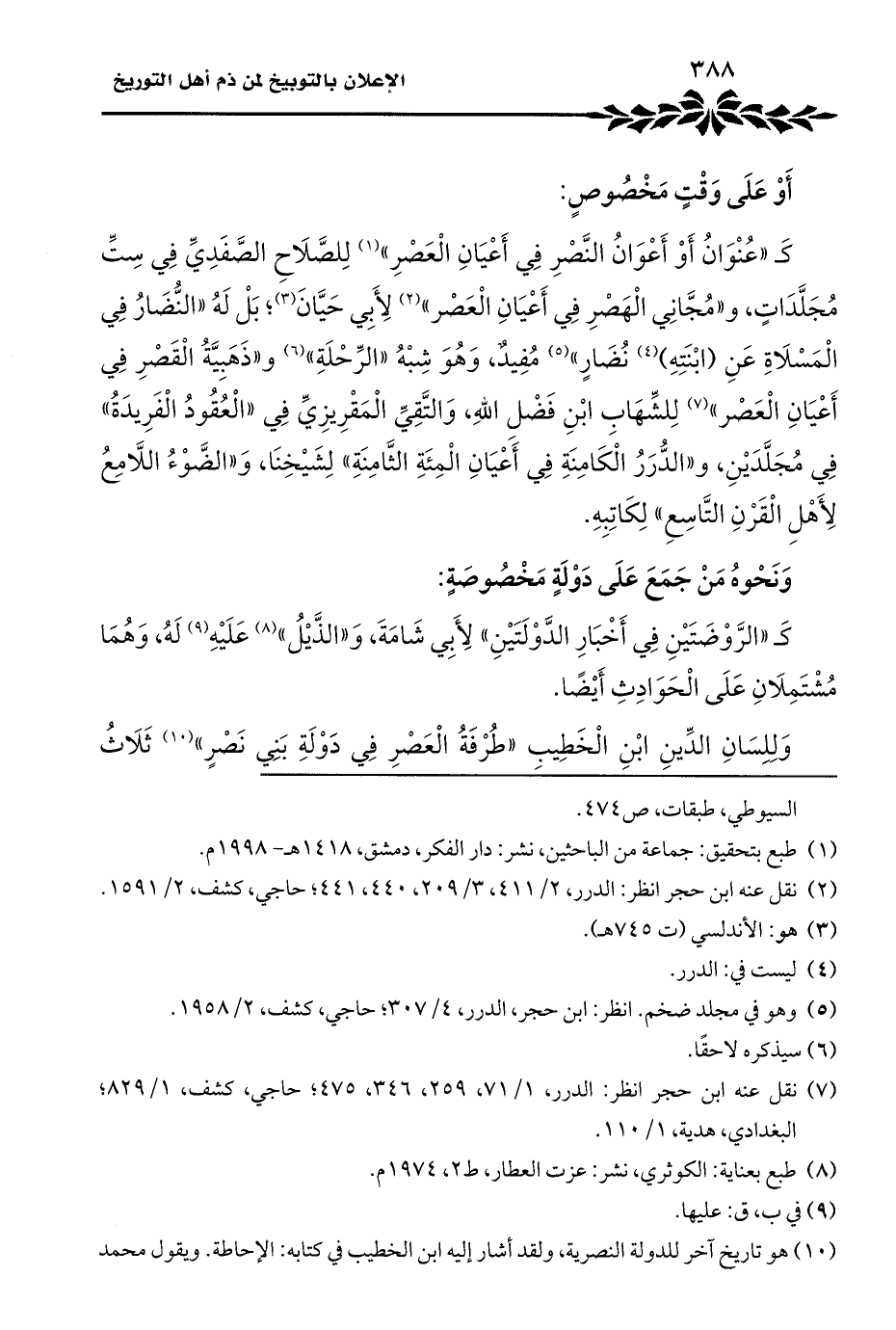 كَـ "عُنْوَانُ أَوْ أَعْوَانُ النَّصْرِ فِي أَعْيَانِ الْعَصْرِ" (¬١) لِلصَّلَاحِ الصَّفَدِيِّ فِي سِتِّ مُجَلَّدَاتٍ، و "مُجَّانِي الْهَصْرِ فِي أَعْيَانِ الْعَصْر" (¬٢) لِأَبِي حَيَّانَ (¬٣)؛ بَلْ لَهُ "النُّضَارُ فِي الْمَسْلَاةِ عَنِ (ابْنَتِهِ) (¬٤) نُضَارٍ" (¬٥) مُفِيدٌ، وَهُوَ شِبْهُ "الرِّحْلَةِ" (¬٦) و "ذَهَبِيَّةُ الْقَصْرِ فِي أَعْيَانِ الْعَصْر" (¬٧) لِلشِّهَابِ ابْنِ فَضلِ اللهِ، وَالتَّقِيِّ الْمَقْرِيزِيِّ فِي "الْعُقُودُ الْفَرِيدَةُ" فِي مُجَلَّدَيْنِ، و "الدُّرَرُ الْكَامِنَةِ فِي أَعْيَانِ الْمِئَةِ الثَّامِنَةِ" لِشَيْخِنَا، وَ"الضَّوْءُ اللَّامِعُ لِأَهْلِ الْقَرْنِ التَّاسِعِ" لِكَاتِبِهِ.