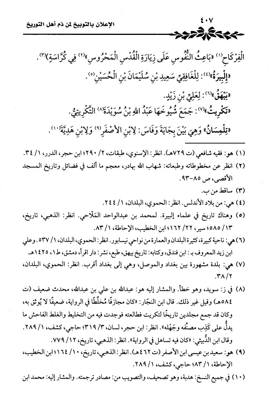 (¬٢) انظر عن مخطوطاته وطبعاته: شهاب الله بهادر، معجم ما ألف في فضائل وتاريخ المسجد الأقصى، ص ٨٥ - ٩٣.