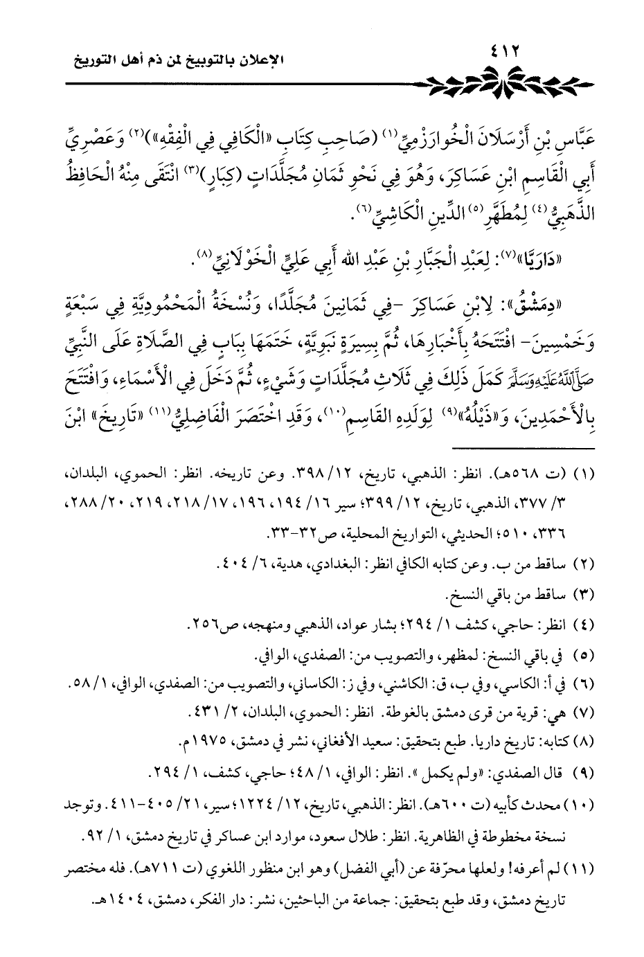 (¬١١) لم أعرفه! ولعلها محرّفة عن (أبي الفضل) وهو ابن منظور اللغوي (ت ٧١١ هـ). فله مختصر تاريخ دمشق، وقد طبع بتحقيق: جماعة من الباحثين، نشر: دار الفكر، دمشق، ١٤٠٤ هـ.