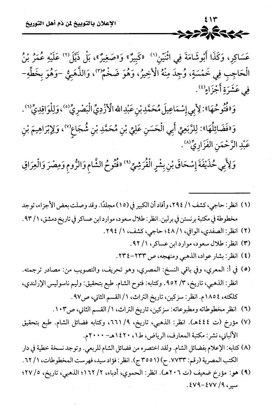 (¬٧) مؤرخ (ت ٤٤٤ هـ). انظر: الذهبي، تاريخ، ٩/ ٦٦١، وكتابه فضائل الشام. طبع بتحقيق الألباني، نشر: مكتبة المعارف، الرياض، ط ١، ١٤٢٠ هـ - ٢٠٠٠ م.