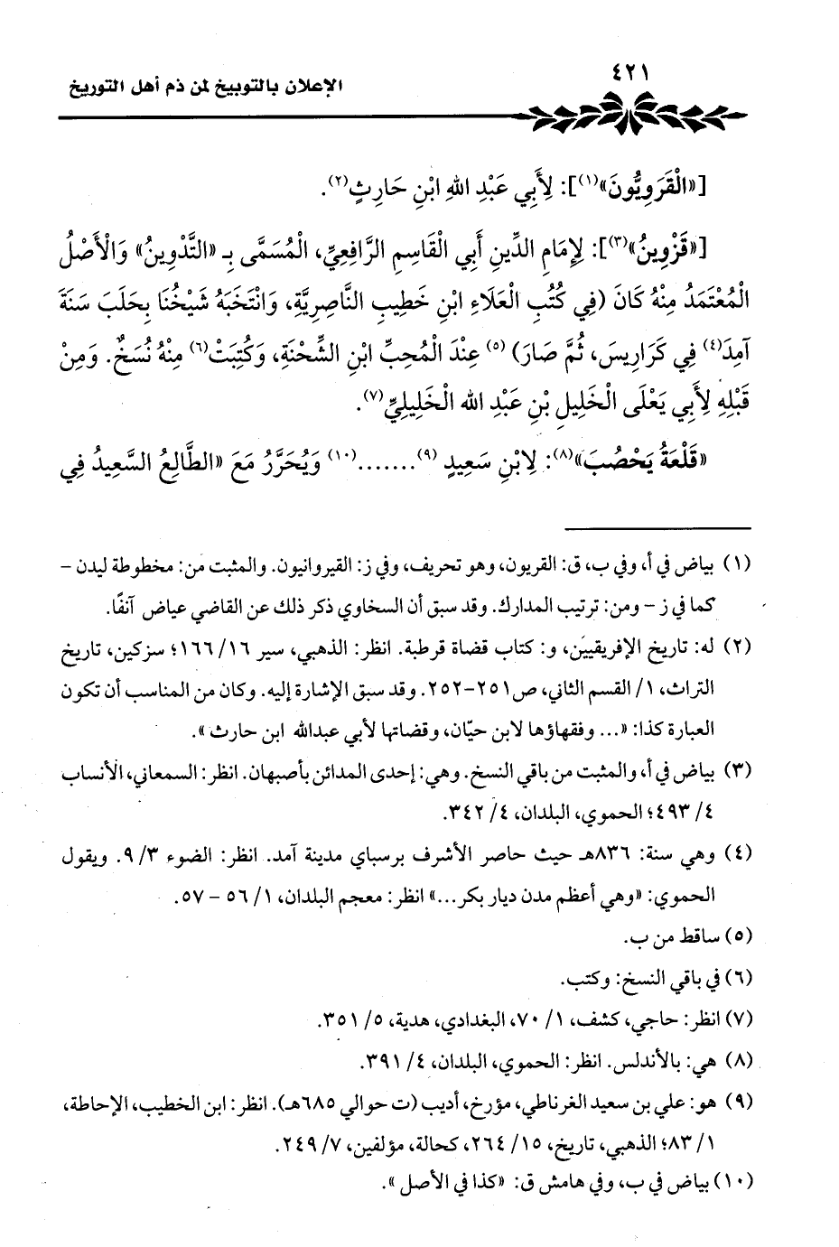 (¬١) بياض في أ، وفي ب، ق: القريون، وهو تحريف، وفي ز: القيروانيون. والمثبت من: مخطوطة ليدن -كما في ز- ومن: ترتيب المدارك. وقد سبق أن السخاوي ذكر ذلك عن القاضي عياض آنفًا.