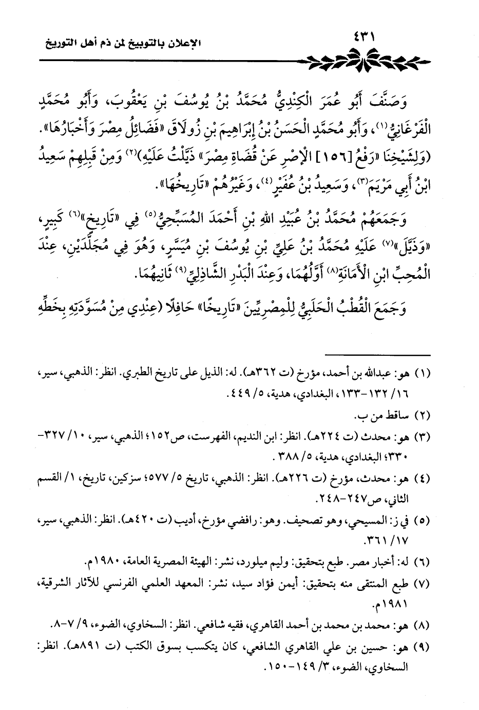 وَصَنَّفَ أَبُو عُمَرَ الْكِنْدِيُّ مُحَمَّدُ بْنُ يُوسُفَ بْنِ يَعْقُوبَ، وَأَبُو مُحَمَّدٍ الْفَرْغَانِيُّ (¬١)، وَأَبُو مُحَمَّدٍ الْحَسَنُ بْنُ إِبْرَاهِيمَ بْنِ زُولَاقَ "فَضَائِلُ مِصْرَ وَأَخْبَارُهَا". (وَلِشَيْخِنَا "رَفْعُ الْإصْرِ عَنْ قُضَاةِ مِصْرَ" ذَيَّلْتُ عَلَيْهِ) (¬٢) وَمِنْ قَبِلِهِمْ سَعِيدُ ابْنُ أَبِي مَرْيَمَ (¬٣)، وَسَعِيدُ بْنُ عُفَيْرٍ (¬٤)، وَغَيْرُهُمْ "تَارِيخُهَا".