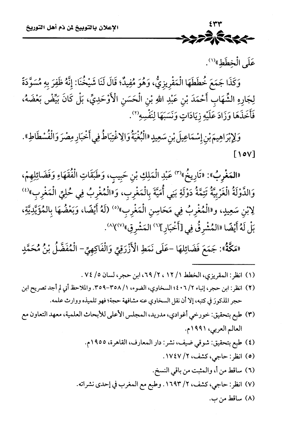 (¬٢) انظر: ابن حجر، إنباء ٢/ ٤٠٦؛ السخاوي، الضوء، ١/ ٣٥٨ - ٣٥٩. والملاحظ أني لم أجد تصريح ابن حجر المذكورَ في كتبه، إلا أن نقل السخاوي عنه مشافهة حجة؛ فهو تلميذه ووارث علمه.