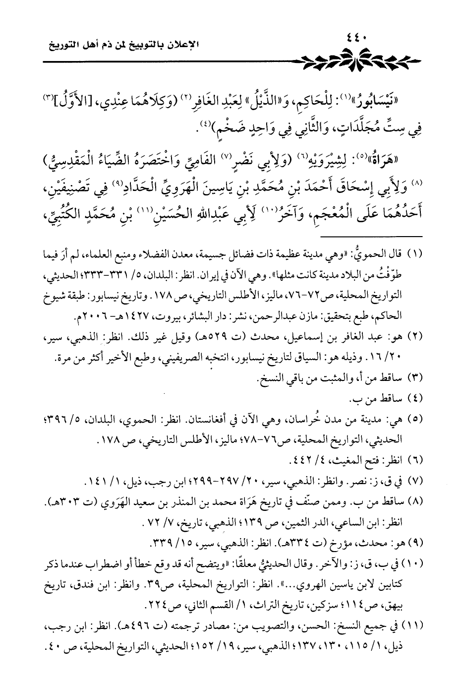 (¬١٠) في ب، ق، ز: والآخر. وقال الحديثيُّ معلقًا: "ويتضح أنه قد وقع خطأ أو اضطراب عندما ذكر كتابين لابن ياسين الهروي ... ". انظر: التواريخ المحلية، ص ٣٩. وانظر: ابن فندق، تاريخ بيهق، ص ١١٤؛ سزكين، تاريخ التراث، ١/ القسم الثاني، ص ٢٢٤.