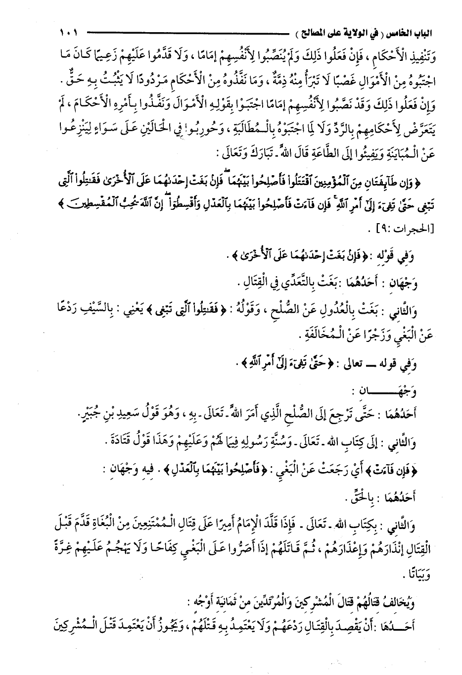 وَإِنْ فَعَلُوا ذَلِكَ وَقَدْ نَصَّبُوا لِأَنْفُسِهِمْ إمَامًا اجْتَبَوْا بِقَوْلِهِ الْأَمْوَالَ وَنَفَّذُوا بِأَمْرِهِ الْأَحْكَامَ، لَمْ يَتَعَرَّضْ لِأَحْكَامِهِمْ بِالرَّدِّ، وَلَا لِمَا اجْتَبَوْهُ بِالْمُطَالَبَةِ، وَحُورِبُوا فِي الْحَالَيْنِ عَلَى سَوَاءٍ؛ لِيَنْزِعُوا عَنِ الْمُبَايَنَةِ وَيَفِيئُوا إلَى الطَّاعَةِ، قَالَ اللَّهُ -تَبَارَكَ وَتَعَالَى: {وَإِنْ طَائِفَتَانِ مِنَ الْمُؤْمِنِينَ اقْتَتَلُوا فَأَصْلِحُوا بَيْنَهُمَا فَإِنْ بَغَتْ إحْدَاهُمَا عَلَى الْأُخْرَى فَقَاتِلُوا الَّتِي تَبْغِي حَتَّى تَفِيءَ إلَى أَمْرِ اللَّهِ فَإِنْ فَاءَتْ فَأَصْلِحُوا بَيْنَهُمَا بِالْعَدْلِ وَأَقْسِطُوا إنَّ اللَّهَ يُحِبُّ الْمُقْسِطِينَ} [الحجرات: 9] .