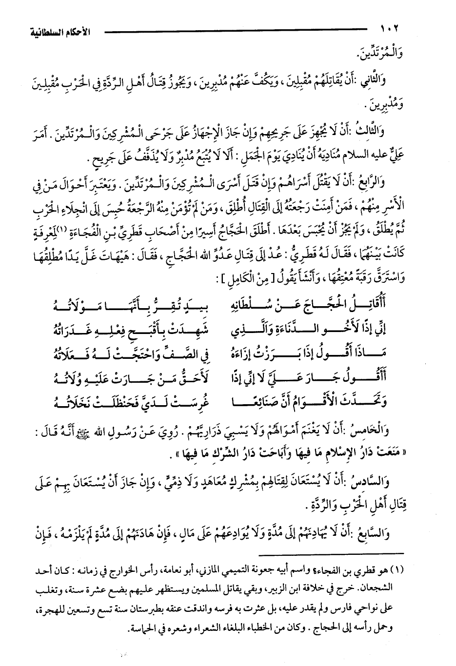 1 هو قطري بن الفجاءة، واسم أبيه جعونة التميمي المازني، أبو نعامة، رأس الخوارج في زمانه، كان أحد الشجعان، خرج في خلافة ابن الزبير، وبقي يقاتل المسلمين ويستظهر عليهم بضع عشرة سنة، وتغلب على نواحي فارس ولم يقدر عليه، بل عثرت به فرسه واندقت عنقه بطبرستان سنة تسع وتسعين للهجرة، وحمل رأسه إلى الحجاج، وكان من الخطباء البلغاء الشعراء، وشعره في الحماسة.
