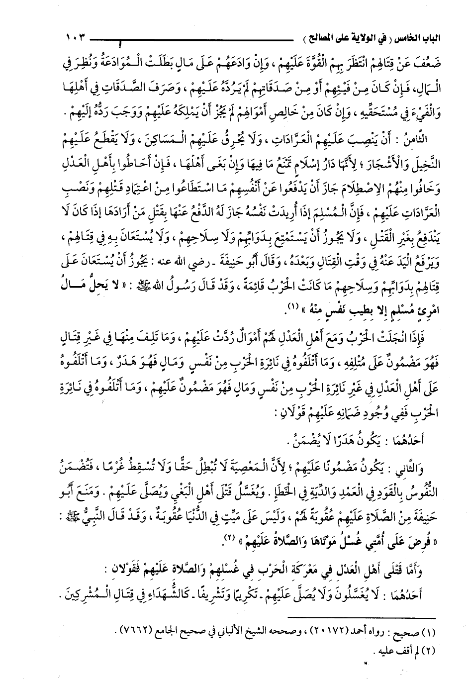 الثَّامِنُ: أَنْ يَنْصِبَ عَلَيْهِمْ الْعَرَّادَاتِ، وَلَا يُحْرِقُ عَلَيْهِمْ الْمَسَاكِنَ، وَلَا يَقْطَعُ عَلَيْهِمْ النَّخِيلَ وَالْأَشْجَارَ؛ لِأَنَّهَا دَارُ إسْلَامٍ تَمْنَعُ مَا فِيهَا وَإِنْ بَغَى أَهْلُهَا، فَإِنْ أَحَاطُوا بِأَهْلِ الْعَدْلِ وَخَافُوا مِنْهُمُ الِاصْطِلَامَ جَازَ أَنْ يَدْفَعُوا عَنْ أَنْفُسِهِمْ مَا اسْتَطَاعُوا مِنِ اعْتِمَادِ قَتْلِهِمْ وَنَصْبِ الْعَرَّادَاتِ عَلَيْهِمْ، فَإِنَّ الْمُسْلِمَ إذَا أُرِيدَتْ نَفْسُهُ جَازَ لَهُ الدَّفْعُ عَنْهَا بِقَتْلِ مَنْ أَرَادَهَا إذَا كَانَ لَا يَنْدَفِعُ بِغَيْرِ الْقَتْلِ، وَلَا يَجُوزُ أَنْ يَسْتَمْتِعَ بِدَوَابِّهِمْ وَلَا سِلَاحِهِمْ، وَلَا يُسْتَعَانَ بِهِ فِي قِتَالِهِمْ، وَيَرْفَعُ الْيَدَ عَنْهُ فِي وَقْتِ الْقِتَالِ وَبَعْدَهُ، وَقَالَ أَبُو حَنِيفَةَ -رَضِيَ اللَّهُ عَنْهُ: يَجُوزُ أَنْ يُسْتَعَانَ عَلَى قِتَالِهِمْ بِدَوَابِّهِمْ وَسِلَاحِهِمْ مَا كَانَتِ الْحَرْبُ قَائِمَةً، وَقَدْ قَالَ رَسُولُ اللَّهِ -صَلَّى اللَّهُ عَلَيْهِ وَسَلَّمَ: "لَا يَحِلُّ مَالُ امْرِئٍ مُسْلِمٍ بِطِيبِ نَفْسٍ مِنْهُ" 1.