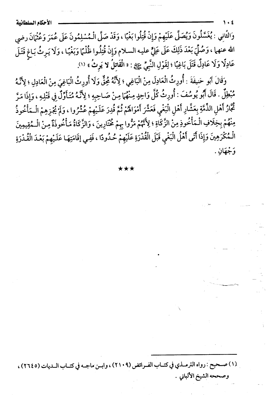 وَالثَّانِي: يُغَسَّلُونَ وَيُصَلَّى عَلَيْهِمْ وَإِنْ قُتِلُوا بَغْيًا، وَقَدْ صَلَّى الْمُسْلِمُونَ عَلَى عُمَرَ وَعُثْمَانَ -رَضِيَ اللَّهُ عَنْهُمَا، وَصُلِّيَ بَعْدَ ذَلِكَ عَلَى عَلِيٍّ -عَلَيْهِ السَّلَامُ، وَإِنْ قُتِلُوا ظُلْمًا وَبَغْيًا، وَلَا يَرِثُ بَاغٍ قَتَلَ عَادِلًا، وَلَا عَادِلٌ قَتَلَ بَاغِيًا؛ لِقَوْلِ النَّبِيِّ -صَلَّى اللَّهُ عَلَيْهِ وَسَلَّمَ: "الْقَاتِلُ لَا يَرِثُ" 1.