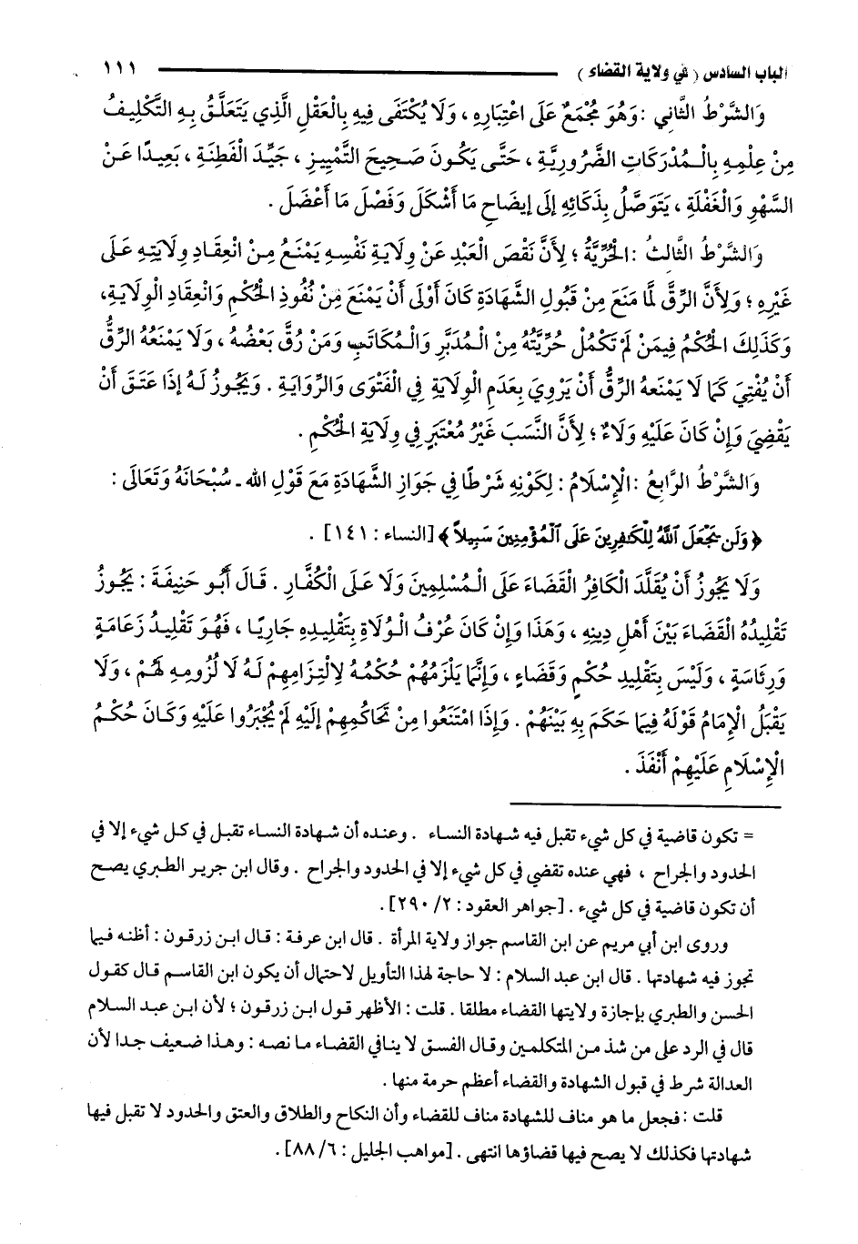 قلت: فجعل ما هو منافٍ الشهادة منافٍ للقضاء، وأن النكاح والطلاق والعتق والحدود لا تقبل فيها شهادتها، فكذلك لا يصح فيها قضاؤها، انتهى. [مواهب الجليل: 6/ 88] .