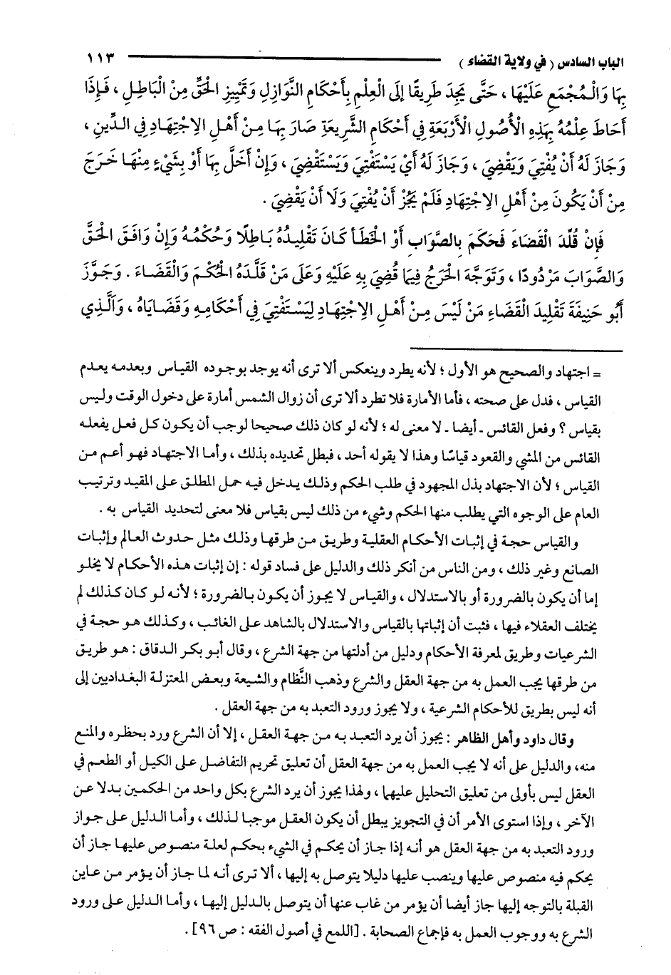بِهَا وَالْمُجْمَعِ عَلَيْهَا، حَتَّى يَجِدَ طَرِيقًا إلَى الْعِلْمِ بِأَحْكَامِ النَّوَازِلِ، وَتَمْيِيزِ الْحَقِّ مِنَ الْبَاطِلِ، فَإِذَا أَحَاطَ عِلْمُهُ بِهَذِهِ الْأُصُولِ الْأَرْبَعَةِ فِي أَحْكَامِ الشَّرِيعَةِ صَارَ بِهَا مِنْ أَهْلِ الِاجْتِهَادِ فِي الدِّينِ، وَجَازَ لَهُ أَنْ يُفْتِيَ وَيَقْضِيَ، وَجَازَ لَهُ أَن يَسْتَفْتِيَ وَيَسْتَقْضِيَ، وَإِنْ أَخَلَّ بِهَا أَوْ بِشَيْءٍ مِنْهَا خَرَجَ مِنْ أَنْ يَكُونَ مِنْ أَهْلِ الِاجْتِهَادِ، فَلَمْ يَجُزْ أَنْ يُفْتِيَ وَلَا أَنْ يَقْضِيَ.