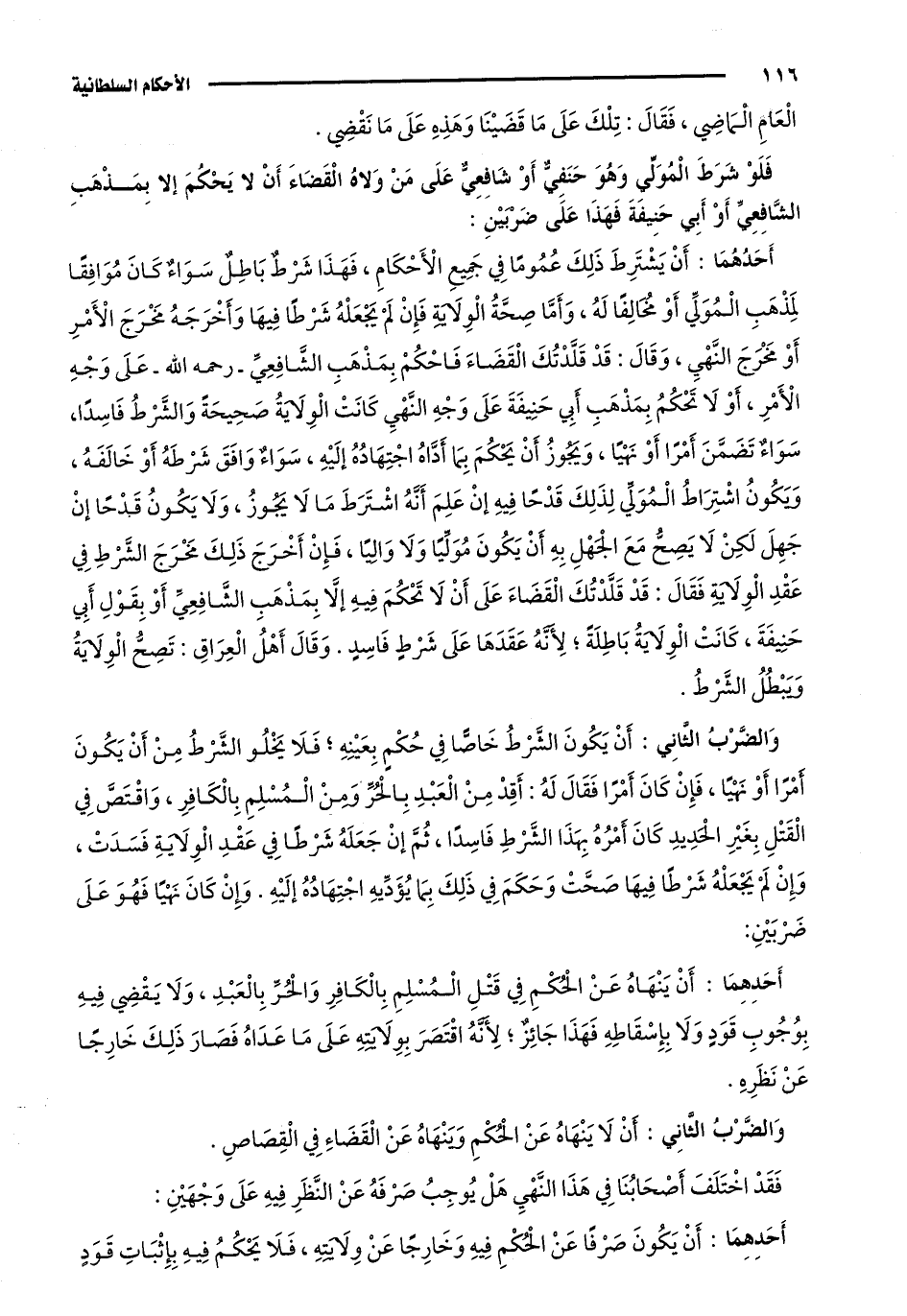 أَحَدُهُمَا: أَنْ يَشْتَرِطَ ذَلِكَ عُمُومًا فِي جَمِيعِ الْأَحْكَامِ، فَهَذَا شَرْطٌ بَاطِلٌ، سَوَاءٌ كَانَ مُوَافِقًا لِمَذْهَبِ الْمُوَلِّي أَوْ مُخَالِفًا لَهُ، وَأَمَّا صِحَّةُ الْوِلَايَةِ فَإِنْ لَمْ يَجْعَلْهُ شَرْطًا فِيهَا، وَأَخْرَجَهُ مَخْرَجَ الْأَمْرِ أَوْ مَخْرَجَ النَّهْيِ، وَقَالَ: قَدْ قَلَّدْتُكَ الْقَضَاءَ فَاحْكُمْ بِمَذْهَبِ الشَّافِعِيِّ -رَحِمَهُ اللَّهُ- عَلَى وَجْهِ الْأَمْرِ، أَوْ لَا تَحْكُمُ بِمَذْهَبِ أَبِي حَنِيفَةَ -عَلَى وَجْهِ النَّهْيِ، كَانَتْ الْوِلَايَةُ صَحِيحَةً وَالشَّرْطُ فَاسِدًا، سَوَاءٌ تَضَمَّنَ أَمْرًا أَوْ نَهْيًا، وَيَجُوزُ أَنْ يَحْكُمَ بِمَا أَدَّاهُ اجْتِهَادُهُ إلَيْهِ، سَوَاءٌ وَافَقَ شَرْطَهُ أَوْ خَالَفَهُ، وَيَكُونُ اشْتِرَاطُ الْمُوَلِّي لِذَلِكَ قَدْحًا فِيهِ إنْ عَلِمَ أَنَّهُ اشْتَرَطَ مَا لَا يَجُوزُ، وَلَا يَكُونُ قَدْحًا إنْ جَهِلَ، لَكِنْ لَا يَصِحُّ مَعَ الْجَهْلِ بِهِ أَنْ يَكُونَ مُوَلِّيًا وَلَا وَالِيًا، فَإِنْ أَخْرَجَ ذَلِكَ مَخْرَجَ الشَّرْطِ فِي عَقْدِ الْوِلَايَةِ فَقَالَ: قَدْ قَلَّدْتُكَ الْقَضَاءَ عَلَى أَنْ لَا تَحْكُمَ فِيهِ إلَّا بِمَذْهَبِ الشَّافِعِيِّ، أَوْ بِقَوْلِ أَبِي حَنِيفَةَ، كَانَتْ الْوِلَايَةُ بَاطِلَةً؛ لِأَنَّهُ عَقَدَهَا عَلَى شَرْطٍ فَاسِدٍ.