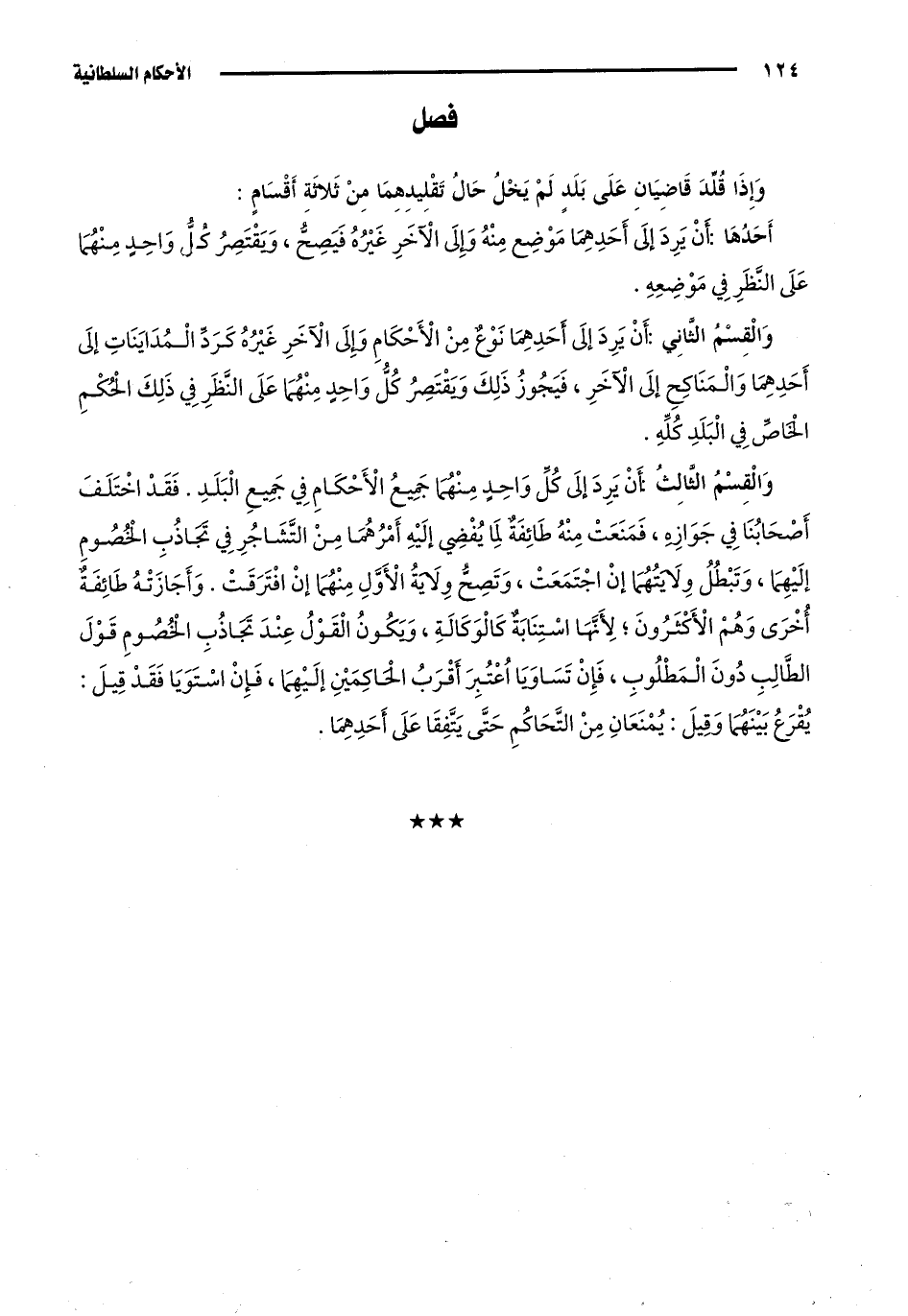 وَالْقِسْمُ الثَّانِي: أَنْ يَرِدَ إلَى أَحَدِهِمَا نَوْعٌ مِنَ الْأَحْكَامِ، وَإِلَى الْآخَرِ غَيْرُهُ؛ كَرَدِّ الْمُدَايَنَاتِ إلَى أَحَدِهِمَا وَالْمَنَاكِحِ إلَى الْآخَرِ، فَيَجُوزُ ذَلِكَ، وَيَقْتَصِرُ كُلُّ وَاحِدٍ مِنْهُمَا عَلَى النَّظَرِ فِي ذَلِكَ الْحُكْمِ الْخَاصِّ فِي الْبَلَدِ كُلِّهِ.