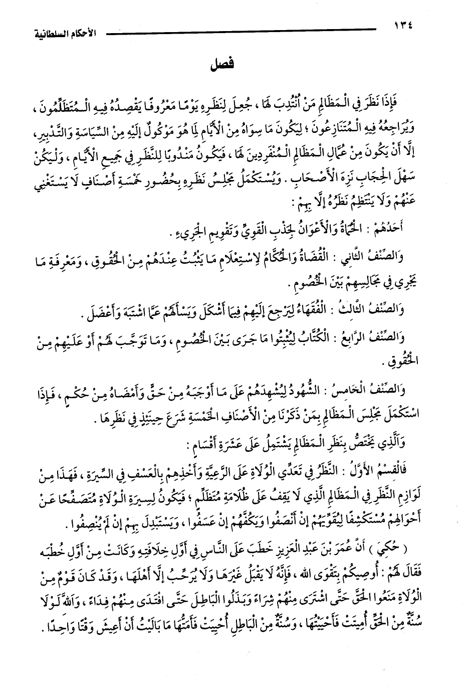 فَإِذَا نَظَرَ فِي الْمَظَالِمِ مَنِ اُنْتُدِبَ لَهَا، جُعِلَ لِنَظَرِهِ يَوْمًا مَعْرُوفًا يَقْصِدُهُ فِيهِ الْمُتَظَلِّمُونَ، وَيُرَاجِعُهُ فِيهِ الْمُتَنَازِعُونَ؛ لِيَكُونَ مَا سِوَاهُ مِنَ الْأَيَّامِ لِمَا هُوَ مَوْكُولٌ إلَيْهِ مِنَ السِّيَاسَةِ وَالتَّدْبِيرِ، إلَّا أَنْ يَكُونَ مِنْ عُمَّالِ الْمَظَالِمِ الْمُنْفَرِدِينَ لَهَا، فَيَكُونُ مَنْدُوبًا لِلنَّظَرِ فِي جَمِيعِ الْأَيَّامِ، وَلْيَكُنْ سَهْلَ الْحِجَابِ نَزِهَ الْأَصْحَابِ، وَيُسْتَكْمَلُ مَجْلِسُ نَظَرِهِ بِحُضُورِ خَمْسَةِ أَصْنَافٍ لَا يَسْتَغْنِي عَنْهُمْ وَلَا يَنْتَظِمُ نَظَرُهُ إلَّا بِهِمْ: