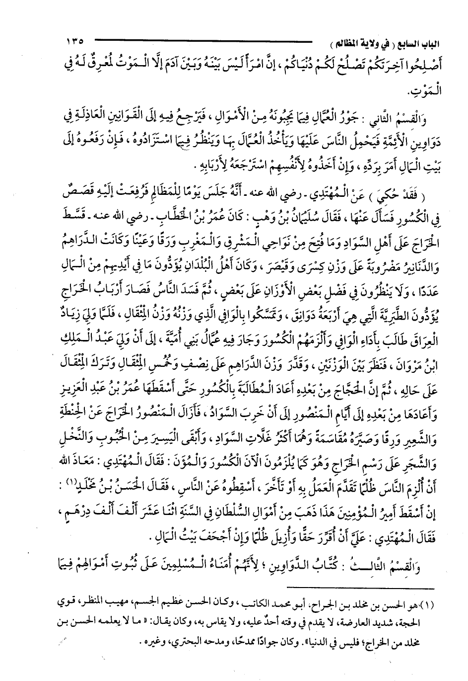 "فَقَدْ حُكِيَ" عَنْ الْمُهْتَدِي -رَضِيَ اللَّهُ عَنْهُ- أَنَّهُ جَلَسَ يَوْمًا لِلْمَظَالِمِ، فَرُفِعَتْ إلَيْهِ قَصَصٌ فِي الْكُسُورِ فَسَأَلَ عَنْهَا، فَقَالَ سُلَيْمَانُ بْنُ وَهْبٍ: كَانَ عُمَرُ بْنُ الْخَطَّابِ -رَضِيَ اللَّهُ عَنْهُ- قَسَّطَ الْخَرَاجَ عَلَى أَهْلِ السَّوَادِ، وَمَا فُتِحَ مِنْ نَوَاحِي الْمَشْرِقِ وَالْمَغْرِبِ وَرَقًا وَعَيْنًا، وَكَانَتْ الدَّرَاهِمُ وَالدَّنَانِيرُ مَضْرُوبَةً عَلَى وَزْنِ كِسْرَى وَقَيْصَرَ، وَكَانَ أَهْلُ الْبُلْدَانِ يُؤَدُّونَ مَا فِي أَيْدِيهِمْ مِنَ الْمَالِ عَدَدًا، وَلَا يَنْظُرُونَ فِي فَضْلِ بَعْضِ الْأَوْزَانِ عَلَى بَعْضٍ، ثُمَّ فَسَدَ النَّاسُ، فَصَارَ أَرْبَابُ الْخَرَاجِ يُؤَدُّونَ الطَّبَرِيَّةَ الَّتِي هِيَ أَرْبَعَةُ دَوَانِقَ، وَتَمَسَّكُوا بِالْوَافِي الَّذِي وَزْنُهُ وَزْنُ الْمِثْقَالِ، فَلَمَّا وَلِيَ زِيَادٌ الْعِرَاقَ طَالَبَ بِأَدَاءِ الْوَافِي، وَأَلْزَمَهُمْ الْكُسُورَ، وَجَارَ فِيهِ عُمَّالُ بَنِي أُمَيَّةَ، إلَى أَنْ وَلِيَ عَبْدُ الْمَلِكِ بْنُ مَرْوَانَ، فَنَظَرَ بَيْنَ الْوَزْنَيْنِ، وَقَدَّرَ وَزْنَ الدَّرَاهِمِ عَلَى نِصْفِ وَخُمُسِ الْمِثْقَالِ، وَتَرَكَ الْمِثْقَالَ عَلَى حَالِهِ، ثُمَّ إنَّ الْحَجَّاجَ مِنْ بَعْدِهِ أَعَادَ الْمُطَالَبَةَ بِالْكُسُورِ حَتَّى أَسْقَطَهَا عُمَرُ بْنُ عَبْدِ الْعَزِيزِ، وَأَعَادَهَا مِنْ بَعْدِهِ إلَى أَيَّامِ الْمَنْصُورِ إلَى أَنْ خَرِبَ السَّوَادُ، فَأَزَالَ الْمَنْصُورُ الْخَرَاجَ عَنِ الْحِنْطَةِ وَالشَّعِيرِ وَرِقًا، وَصَيَّرَهُ مُقَاسَمَةً، وَهُمَا أَكْثَرُ غَلَّاتِ السَّوَادِ، وَأَبْقَى الْيَسِيرَ مِنَ الْحُبُوبِ وَالنَّخْلِ وَالشَّجَرِ عَلَى رَسْمِ الْخَرَاجِ، وَهُوَ كَمَا يُلْزَمُونَ الْآنَ الْكُسُورَ وَالْمُؤَنَ، فَقَالَ الْمُهْتَدِي: مَعَاذَ اللَّهِ أَنْ أُلْزِمَ النَّاسَ ظُلْمًا تَقَدَّمَ الْعَمَلُ بِهِ أَوْ تَأَخَّرَ، أَسْقِطُوهُ عَنِ النَّاسِ، فَقَالَ الْحَسَنُ بْنُ مَخْلَدٍ1: إنْ أَسْقَطَ أَمِيرُ الْمُؤْمِنِينَ هَذَا ذَهَبَ مِنْ أَمْوَالِ السُّلْطَانِ فِي السَّنَةِ اثْنَا عَشَرَ أَلْفَ أَلْفِ دِرْهَمٍ، فَقَالَ الْمُهْتَدِي: عَلَيَّ أَنْ أُقَرِّرَ حَقًّا وَأُزِيلَ ظُلْمًا، وَإِنْ أَجْحَفَ بَيْتُ الْمَالِ.
