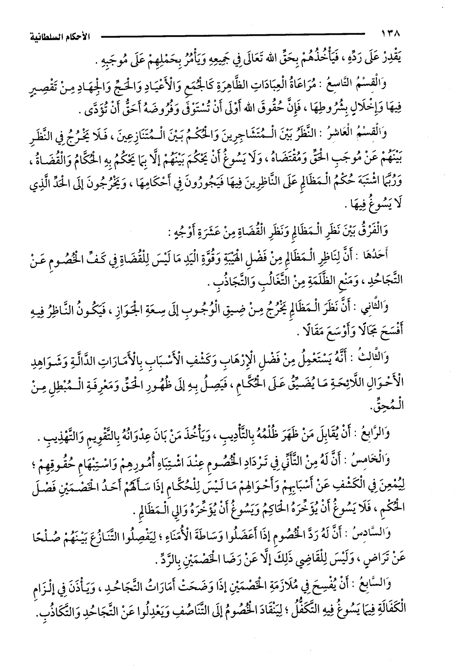 وَالْقِسْمُ الْعَاشِرُ: النَّظَرُ بَيْنَ الْمُتَشَاجِرِينَ وَالْحُكْمُ بَيْنَ الْمُتَنَازِعِينَ، فَلَا يَخْرُجُ فِي النَّظَرِ بَيْنَهُمْ عَنْ مُوجَبِ الْحَقِّ وَمُقْتَضَاهُ، وَلَا يَسُوغُ أَنْ يَحْكُمَ بَيْنَهُمْ إلَّا بِمَا يَحْكُمُ بِهِ الْحُكَّامُ وَالْقُضَاةُ، وَرُبَّمَا اشْتَبَهَ حُكْمُ الْمَظَالِمِ عَلَى النَّاظِرِينَ فِيهَا، فَيَجُورُونَ فِي أَحْكَامِهَا، وَيَخْرُجُونَ إلَى الْحَدِّ الَّذِي لَا يَسُوغُ فِيهَا.