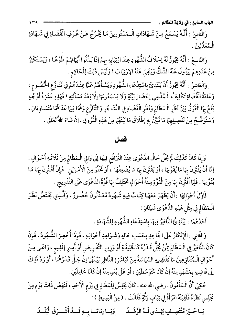 وَالْعَاشِرُ: أَنَّهُ يَجُوزُ أَنْ يَبْتَدِئَ بِاسْتِدْعَاءِ الشُّهُودِ، وَيَسْأَلَهُمْ عَمَّا عِنْدَهُمْ فِي تَنَازُعِ الْخُصُومِ، وَعَادَةُ الْقُضَاةِ تَكْلِيفُ الْمُدَّعِي إحْضَارَ بَيِّنَةٍ وَلَا يَسْمَعُونَهَا إلَّا بَعْدَ مَسْأَلَتِهِ؛ فَهَذِهِ عَشَرَةُ أَوْجُهٍ يَقَعُ بِهَا الْفَرْقُ بَيْنَ نَظَرِ الْمَظَالِمِ وَنَظَرِ الْقَضَاءِ فِي التَّشَاجُرِ وَالتَّنَازُعِ وَهُمَا فِيمَا عَدَاهُمَا مُتَسَاوِيَانِ، وَسَنُوَضِّحُ مِنْ تَفْصِيلِهِمَا مَا نُبَيِّنُ بِهِ إطْلَاقَ مَا بَيْنَهُمَا مِنْ هَذِهِ الْفُرُوقِ -إنْ شَاءَ اللَّهُ تَعَالَى.