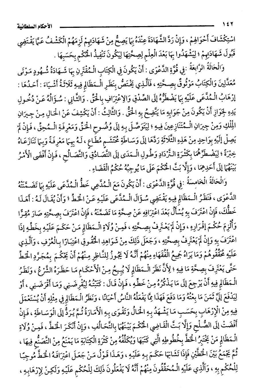 وَالْحَالَةُ الرَّابِعَةُ: فِي قُوَّةِ الدَّعْوَى: أَنْ يَكُونَ فِي الْكِتَابِ الْمُقْتَرِنِ بِهَا شَهَادَةُ شُهُودٍ مَوْتَى مُعَدَّلِينَ، وَالْكِتَابُ مَوْثُوقٌ بِصِحَّتِهِ، فَاَلَّذِي يَخْتَصُّ بِنَظَرِ الْمَظَالِمِ فِيهِ ثَلَاثَةُ أَشْيَاءَ: