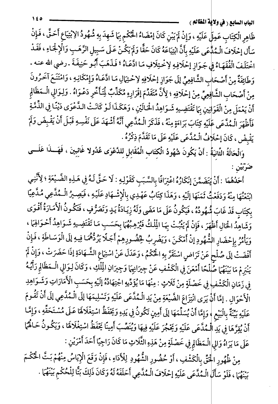 وَلِوَالِي الْمَظَالِمِ أَنْ يَعْمَلَ مِنَ الْقَوَانِينِ بِمَا تَقْتَضِيهِ شَوَاهِدُ الْحَالَيْنِ، وَهَكَذَا لَوْ كَانَتْ الدَّعْوَى دَيْنًا فِي الذِّمَّةِ، فَأَظْهَرَ الْمُدَّعَى عَلَيْهِ كِتَابَ بَرَاءَةٍ مِنْهُ، فَذَكَرَ الْمُدَّعِي أَنَّهُ أَشْهَدَ عَلَى نَفْسِهِ قَبْلَ أَنْ يَقْبِضَ، وَلَمْ يَقْبِضْ كَانَ إحْلَافُ الْمُدَّعَى عَلَيْهِ عَلَى مَا تَقَدَّمَ ذِكْرُهُ.