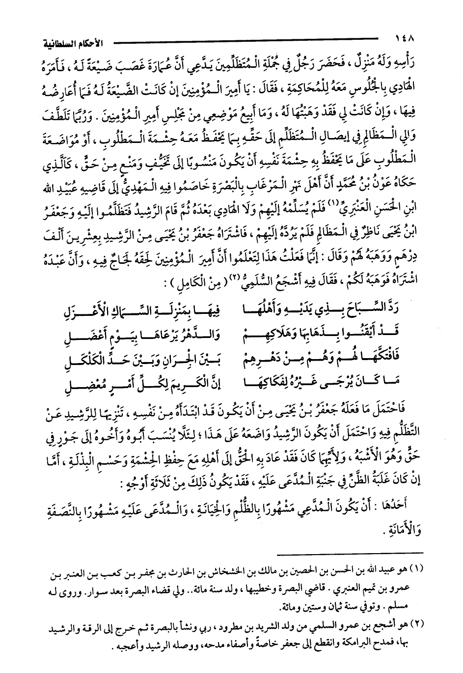 وَرُبَّمَا تَلَطَّفَ وَالِي الْمَظَالِمِ فِي إيصَالِ الْمُتَظَلِّمِ إلَى حَقِّهِ بِمَا يَحْفَظُ مَعَهُ حِشْمَةَ الْمَطْلُوبِ، أَوْ مُوَاضَعَةَ الْمَطْلُوبِ عَلَى مَا يَحْفَظُ بِهِ حِشْمَةَ نَفْسِهِ أَنْ يَكُونَ مَنْسُوبًا إلَى تَخَيُّفٍ وَمَنْعٍ مِنْ حَقٍّ، كَاَلَّذِي حَكَاهُ عَوْنُ بْنُ مُحَمَّدٍ أَنَّ أَهْلَ نَهْرِ الْمَرْغَابِ بِالْبَصْرَةِ خَاصَمُوا فِيهِ الْمَهْدِيُّ إلَى قَاضِيهِ عُبَيْدِ اللَّهِ بْنِ الْحَسَنِ الْعَنْبَرِيِّ1، فَلَمْ يُسَلِّمْهُ إلَيْهِمْ وَلَا الْهَادِي بَعْدَهُ، ثُمَّ قَامَ الرَّشِيدُ فَتَظَلَّمُوا إلَيْهِ، وَجَعْفَرُ بْنُ يَحْيَى نَاظِرٌ فِي الْمَظَالِمِ فَلَمْ يَرُدَّهُ إلَيْهِمْ، فَاشْتَرَاهُ جَعْفَرُ بْنُ يَحْيَى مِنَ الرَّشِيدِ بِعِشْرِينَ أَلْفَ دِرْهَمٍ وَوَهَبَهُ لَهُمْ، وَقَالَ: إنَّمَا فَعَلْتُ هَذَا لِتَعْلَمُوا أَنَّ أَمِيرَ الْمُؤْمِنِينَ لَحِقَهُ لَجَاجٌ فِيهِ، وَأَنَّ عَبْدَهُ اشْتَرَاهُ فَوَهَبَهُ لَكُمْ، فَقَالَ فِيهِ أَشْجَعُ السُّلَمِيُّ2 "مِنَ الْكَامِلِ":