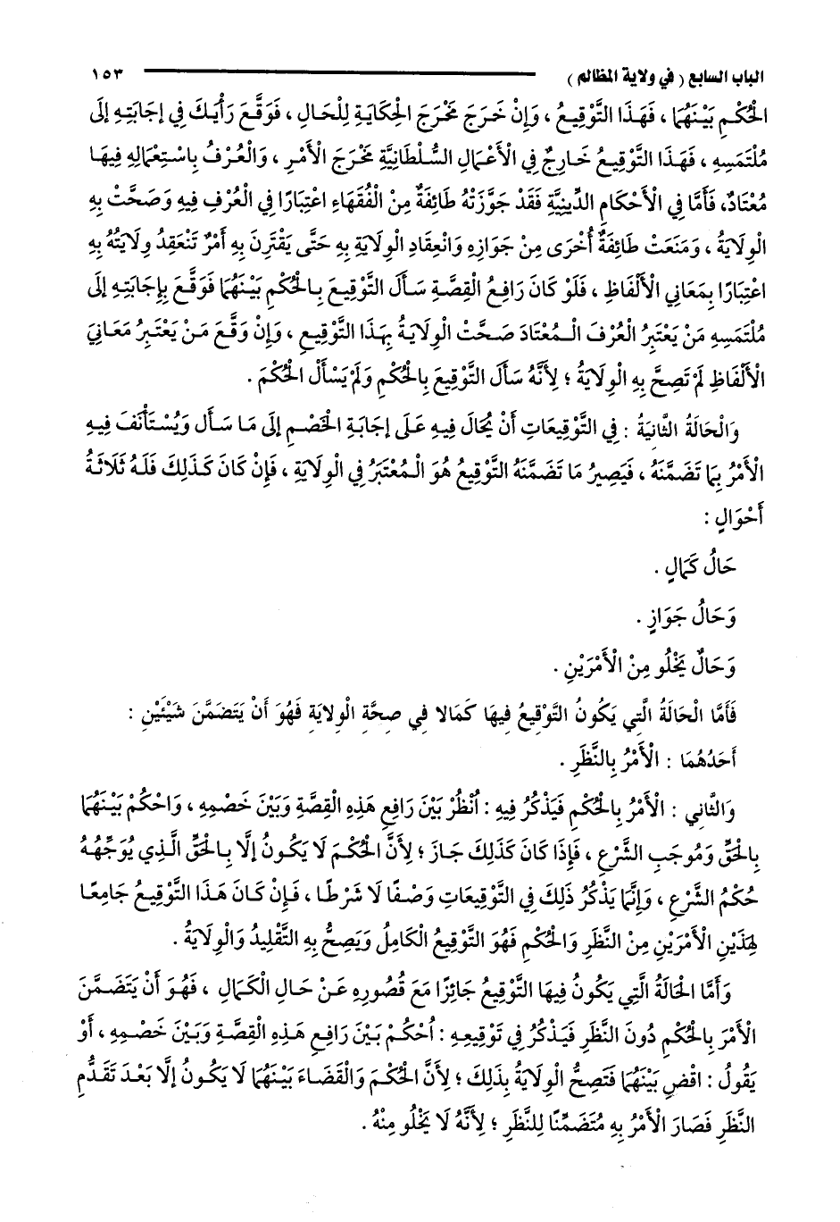 وَالثَّانِي: الْأَمْرُ بِالْحُكْمِ، فَيَذْكُرُ فِيهِ: اُنْظُرْ بَيْنَ رَافِعِ هَذِهِ الْقِصَّةِ وَبَيْنَ خَصْمِهِ، وَاحْكُمْ بَيْنَهُمَا بِالْحَقِّ وَمُوجَبِ الشَّرْعِ، فَإِذَا كَانَ كَذَلِكَ جَازَ؛ لِأَنَّ الْحُكْمَ لَا يَكُونُ إلَّا بِالْحَقِّ الَّذِي يُوَجِّهُهُ حُكْمُ الشَّرْعِ، وَإِنَّمَا يَذْكُرُ ذَلِكَ فِي التَّوْقِيعَاتِ وَصْفًا لَا شَرْطًا، فَإِنْ كَانَ هَذَا التَّوْقِيعُ جَامِعًا لِهَذَيْنِ الْأَمْرَيْنِ مِنَ النَّظَرِ وَالْحُكْمِ، فَهُوَ التَّوْقِيعُ الْكَامِلُ وَيَصِحُّ بِهِ التَّقْلِيدُ وَالْوِلَايَةُ.