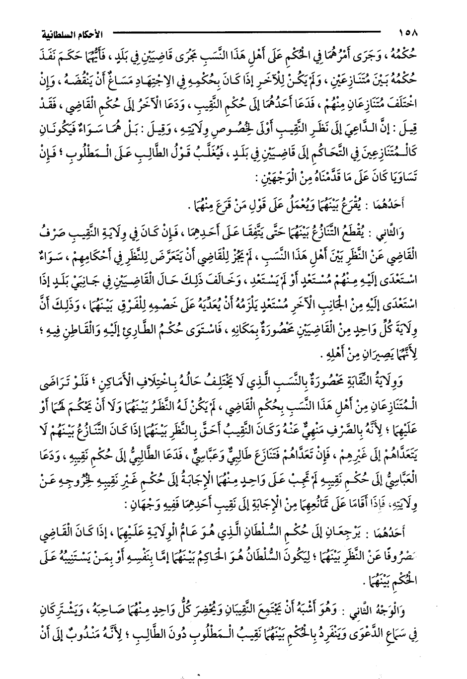 حُكْمُهُ، وَجَرَى أَمْرُهُمَا فِي الْحُكْمِ عَلَى أَهْلِ هَذَا النَّسَبِ مَجْرَى قَاضِيَيْنِ فِي بَلَدٍ، فَأَيُّهُمَا حَكَمَ نَفَذَ حُكْمُهُ بَيْنَ مُتَنَازِعَيْنِ، وَلَمْ يَكُنْ لِلْآخَرِ إذَا كَانَ بِحُكْمِهِ فِي الِاجْتِهَادِ مَسَاغٌ أَنْ يَنْقُضَهُ، وَإِنْ اخْتَلَفَ مُتَنَازِعَانِ مِنْهُمْ، فَدَعَا أَحَدُهُمَا إلَى حُكْمِ النَّقِيبِ، وَدَعَا الْآخَرُ إلَى حُكْمِ الْقَاضِي، فَقَدْ قِيلَ: إنَّ الدَّاعِيَ إلَى نَظَرِ النَّقِيبِ أَوْلَى لِخُصُوصِ وِلَايَتِهِ، وَقِيلَ: بَلْ هُمَا سَوَاءٌ، فَيَكُونَانِ كَالْمُتَنَازِعِينَ فِي التَّحَاكُمِ إلَى قَاضِيَيْنِ فِي بَلَدٍ، فَيُغَلَّبُ قَوْلُ الطَّالِبِ عَلَى الْمَطْلُوبِ؛ فَإِنْ تَسَاوَيَا كَانَ عَلَى مَا قَدَّمْنَاهُ مِنَ الْوَجْهَيْنِ: